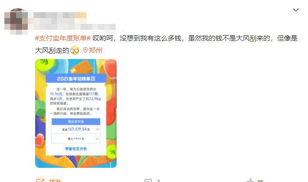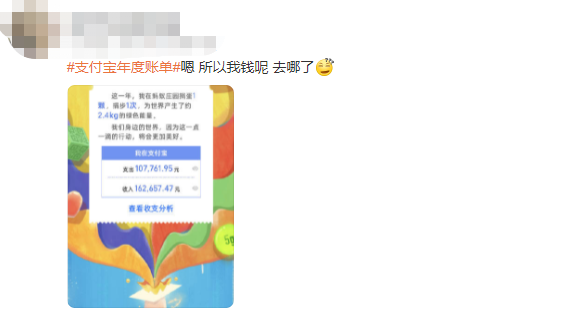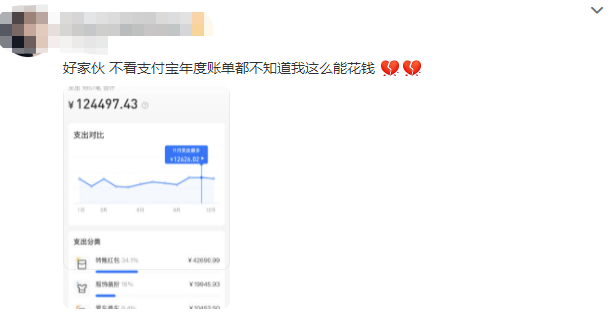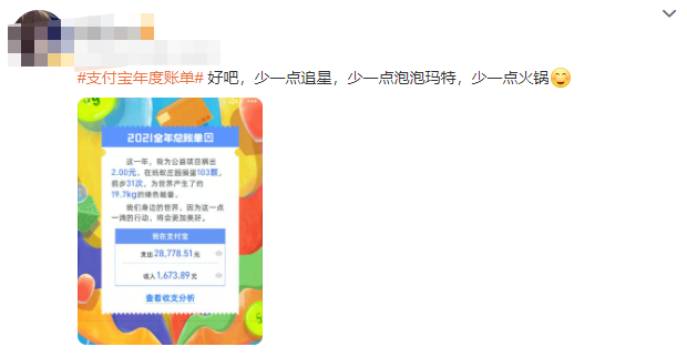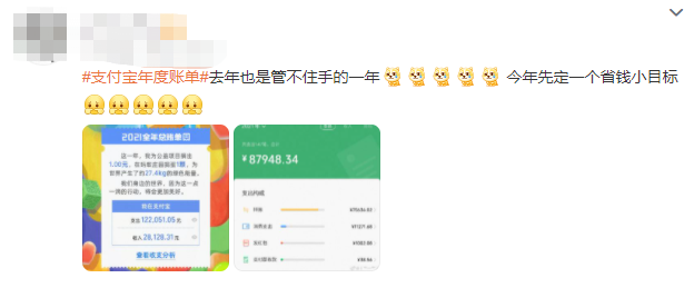 支付宝账单除了大家最关心的收入、支出外,还包括收集能量、生活缴费、捐鸡蛋、点外卖、看电影、走路步数等多个数据,比往年更加全面。