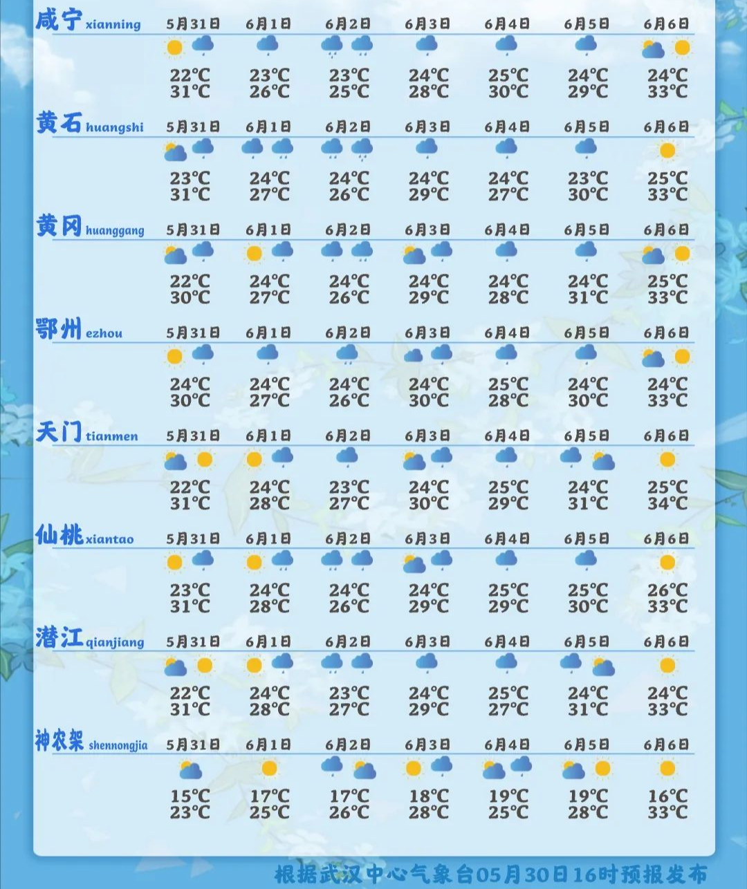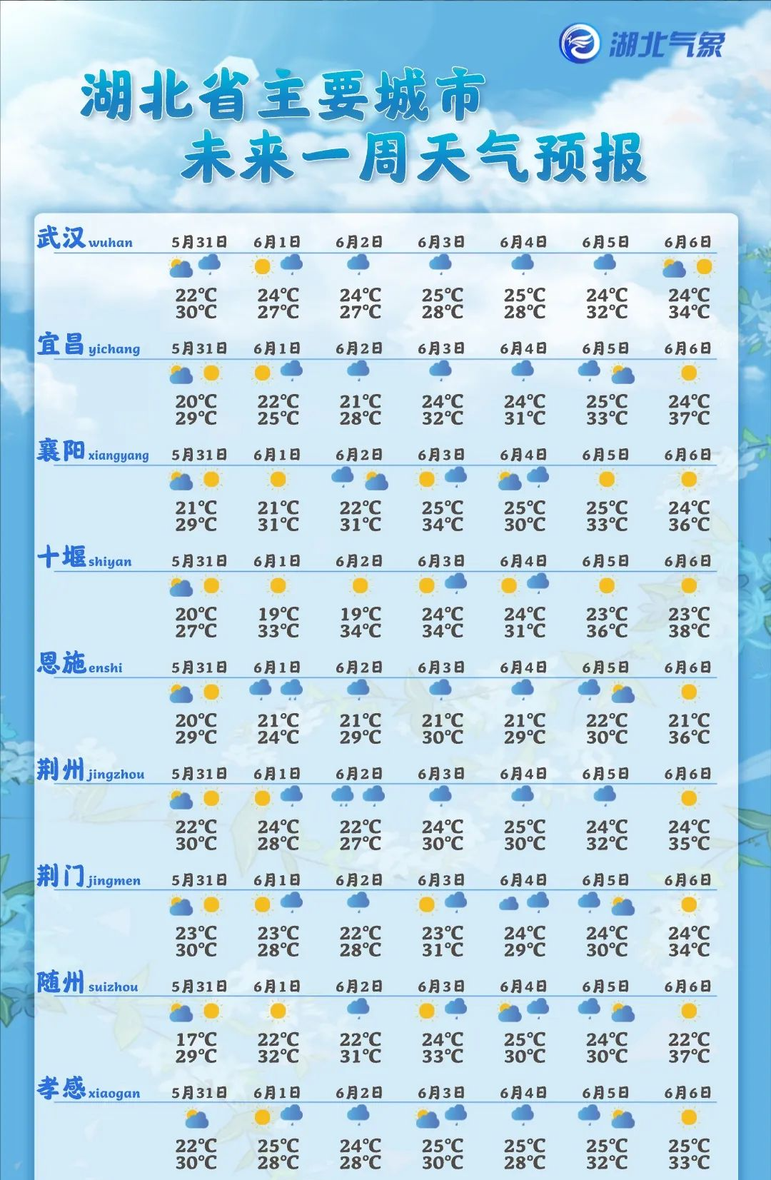 明天湖北大部晴天到多云鄂东地区多云转阵雨6月1日儿童节到6月2日湖北有一次降水过程东部、南部有中到大雨局部暴雨并伴有雷电其他地区小雨6月3日端午节到6月5日湖北南部小到中雨北部多云,局部阵雨气温则变幅不大最近雨水频繁