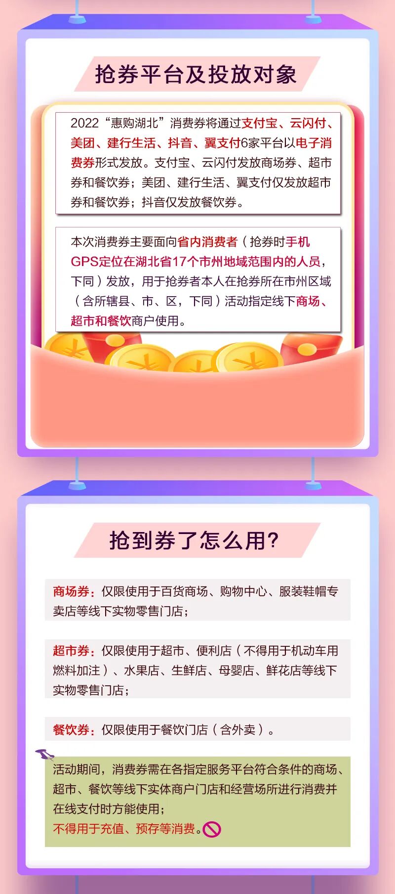(一)活动期间,符合活动参与条件的用户可在手机打开支付宝APP,搜索“惠购湖北”,即可进入“惠购湖北”会场。可在会场活动页面上9张消费券(3种不同类别分别有3种不同面额)中自主选择1张,活动期间同一用户只可领取一次。