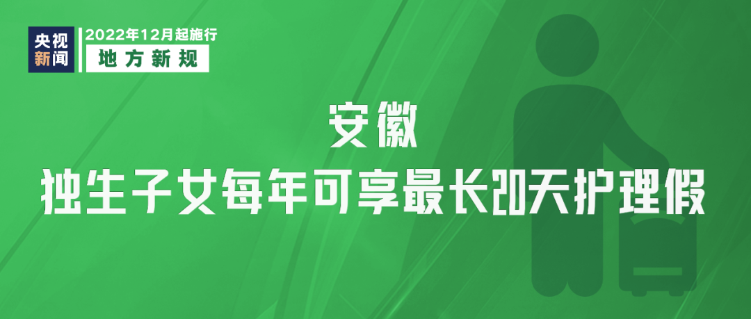 《安徽省养老服务条例》12月1日起施行,明确机关、企业事业单位和社会组织职工父母年满60周岁患病住院的,独生子女每年可享最长20天护理假,非独生子女每年可享最长7天护理假。