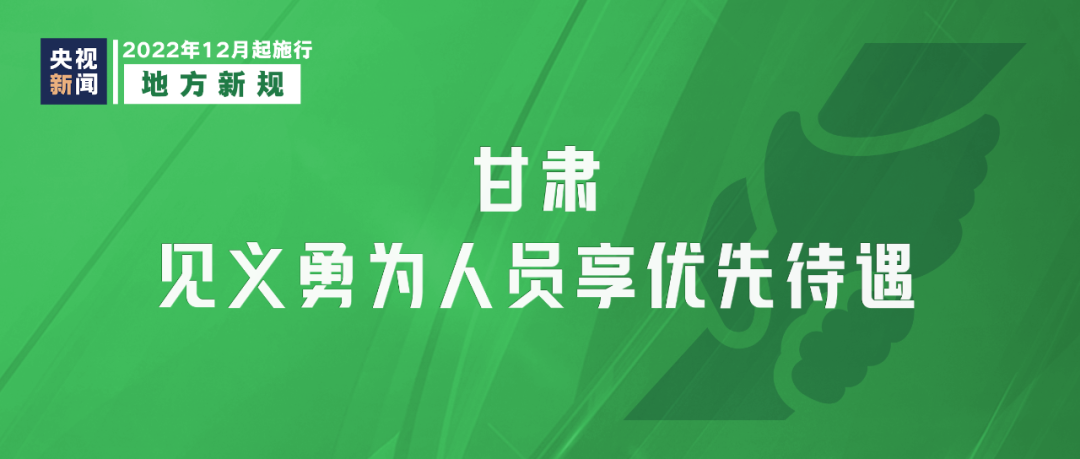 修订后的《甘肃省奖励和保护见义勇为人员条例》12月1日起施行,明确见义勇为人员依法享有医疗保障、误工补贴、生活补助、伤残抚恤等优待,见义勇为人员报考公务员或者参加企业事业单位招聘的,同等条件下优先录用。