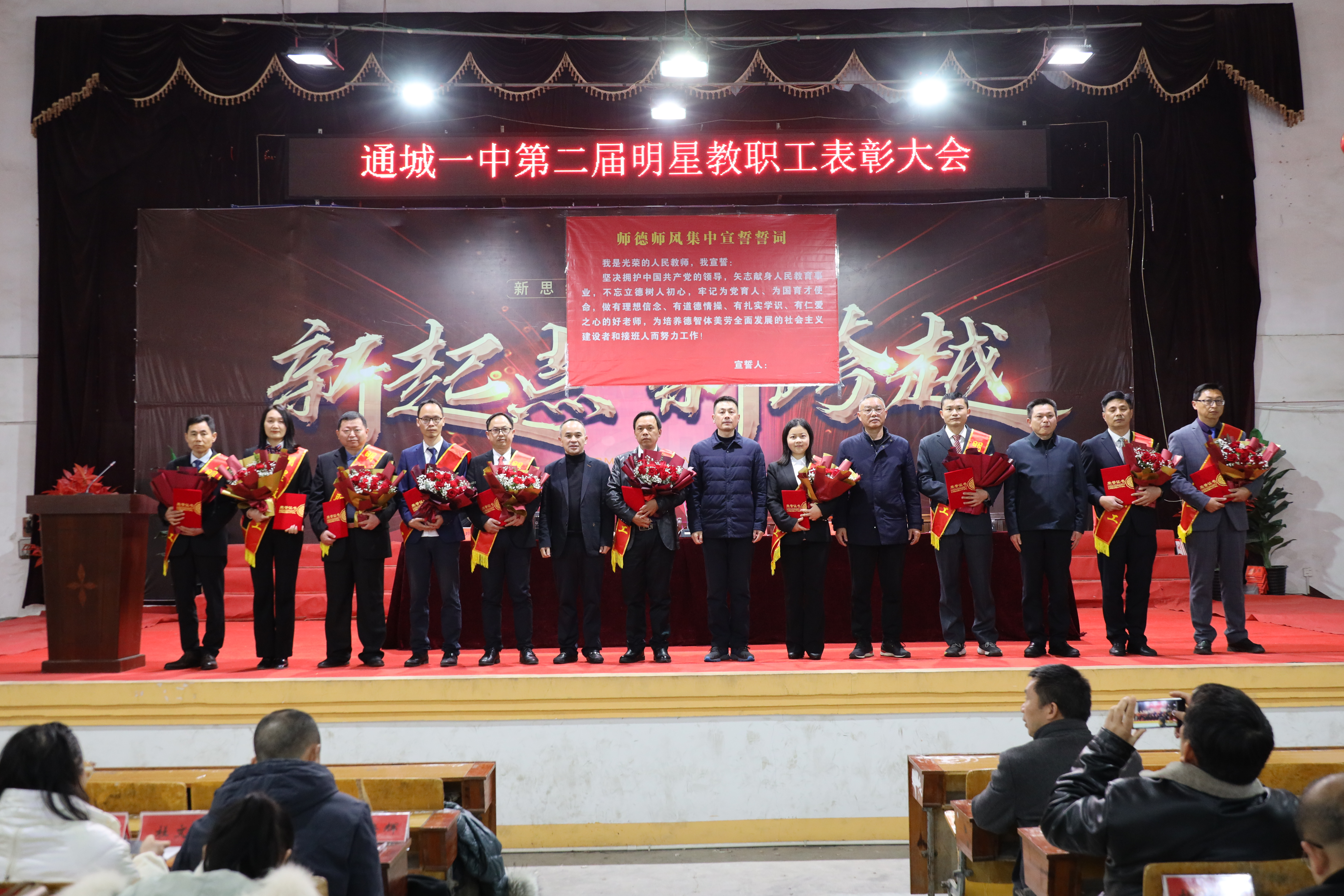 颁奖仪式上,10名“明星教职工”依次登台,刘波与通城一中知名校友、红珊瑚药业董事长王高华共同为“明星教职工”们颁奖。
