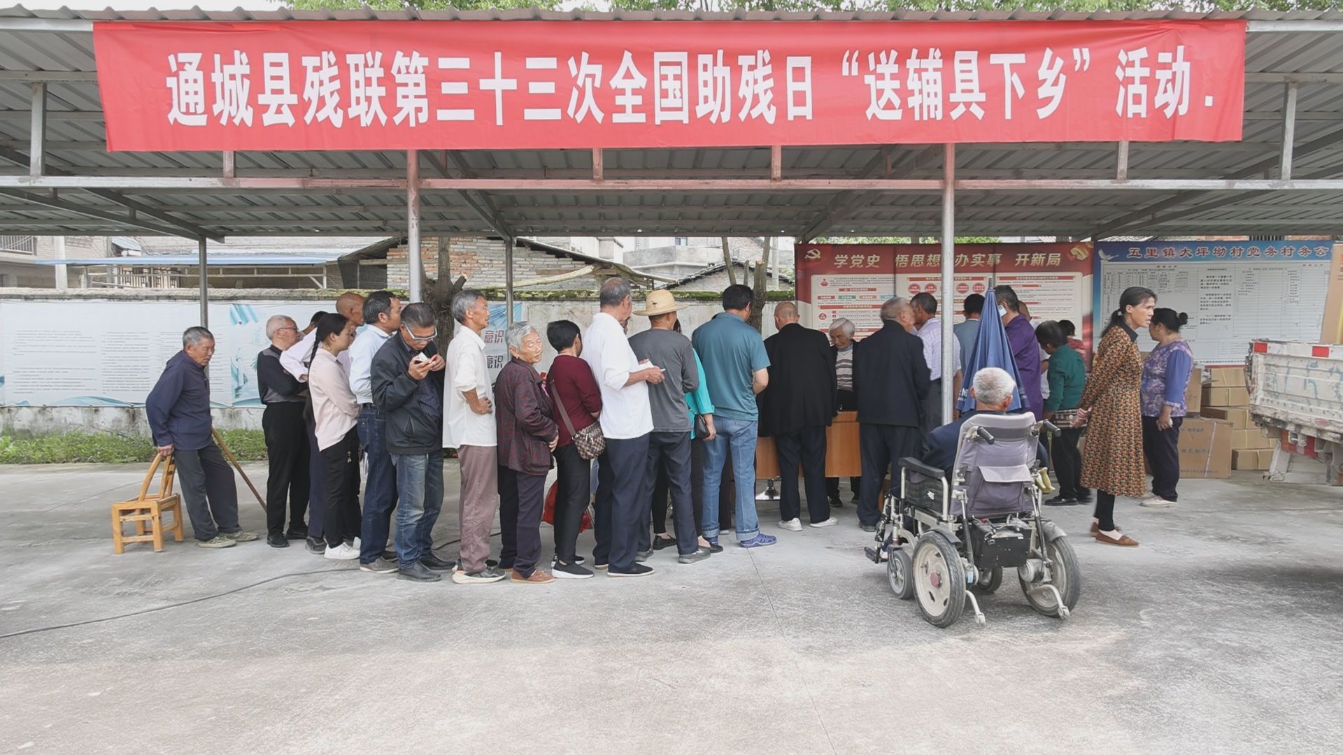在五里镇大坪坳村“送辅具下乡”活动现场,来自大坪坳村60多名残疾人家属免费领取轮椅、拐杖、洗浴凳椅等生活辅助工具。
