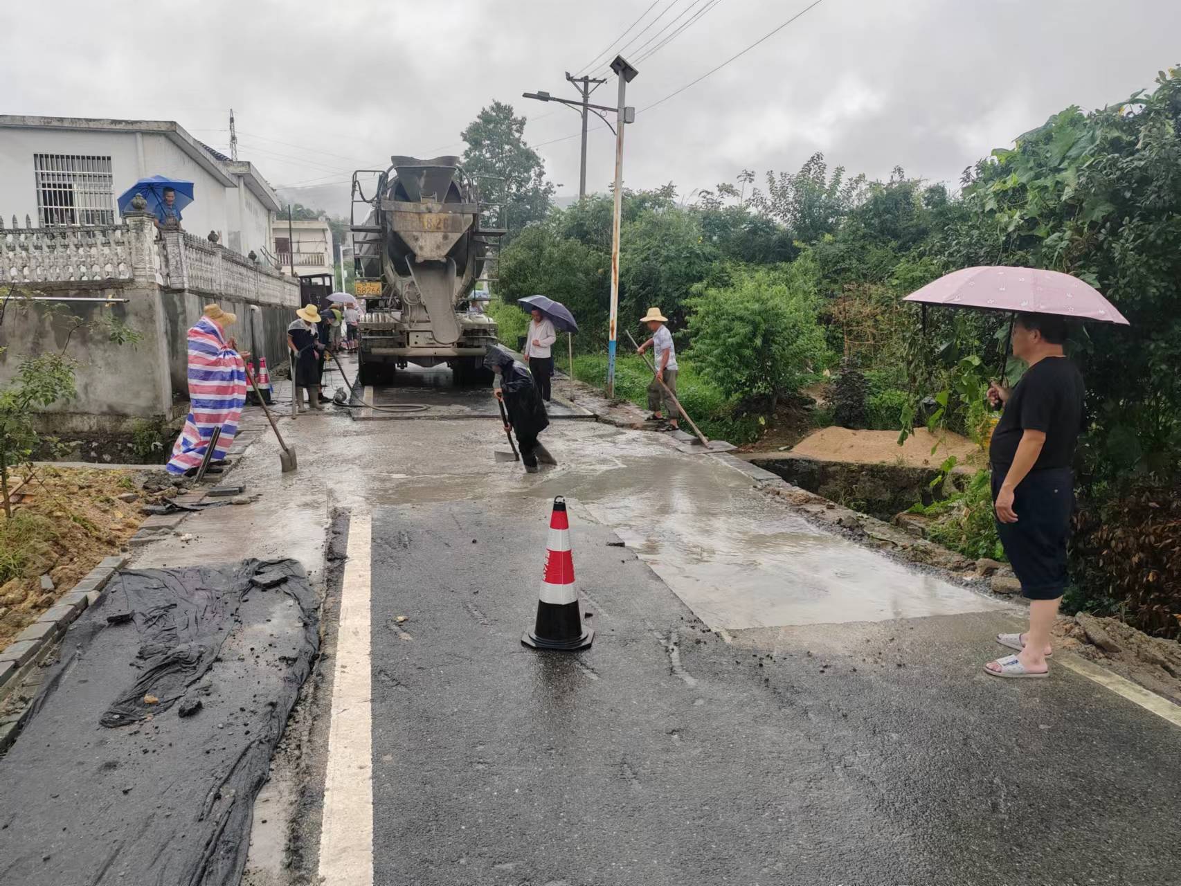 7月17日,麦市镇下着大暴雨,葛先富打着伞冒着雨和施工队一起抢修路面。他说:“混凝土超过3个小时不用就用不了了,我们不能浪费,所以下雨也不能停!”