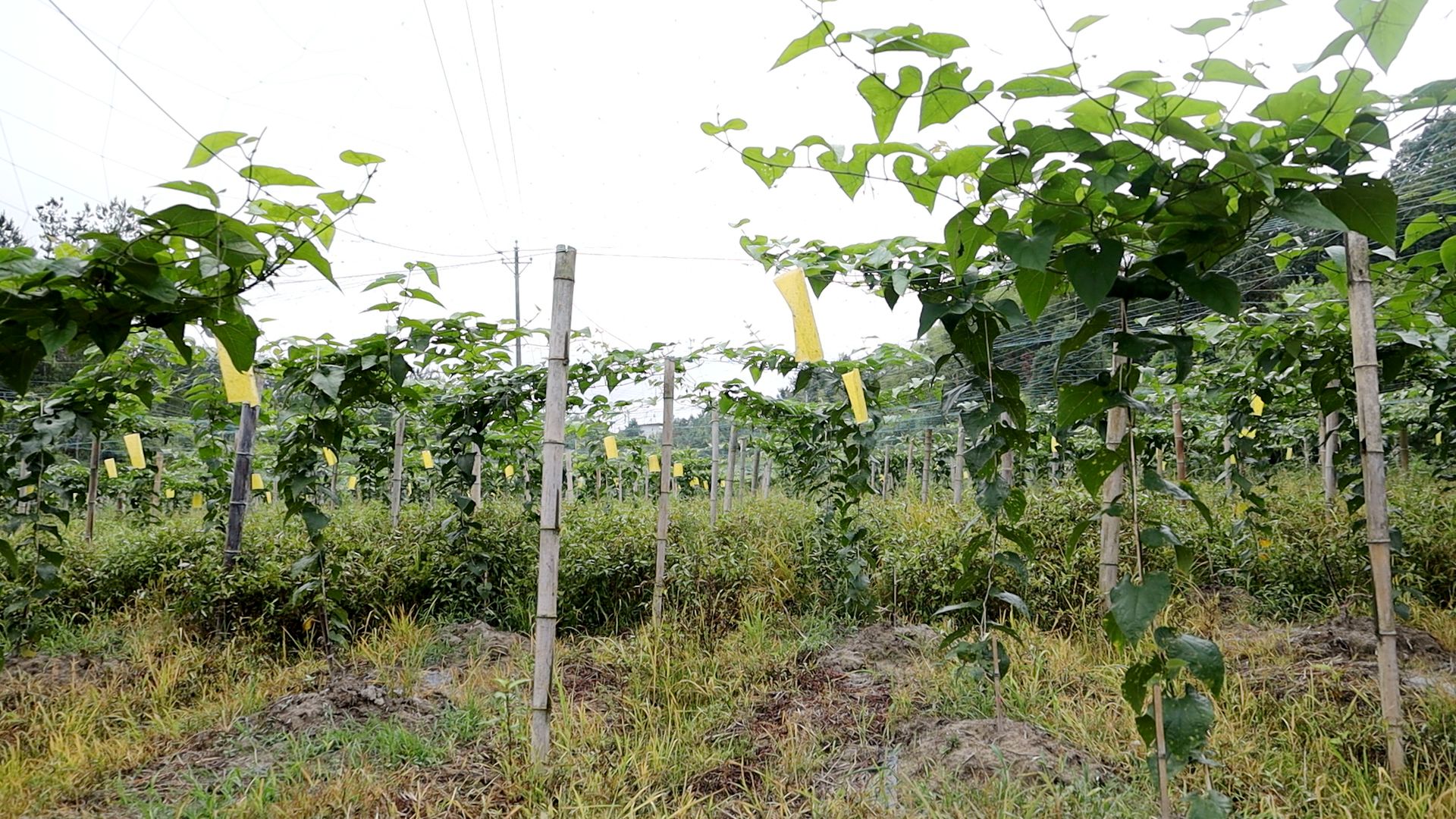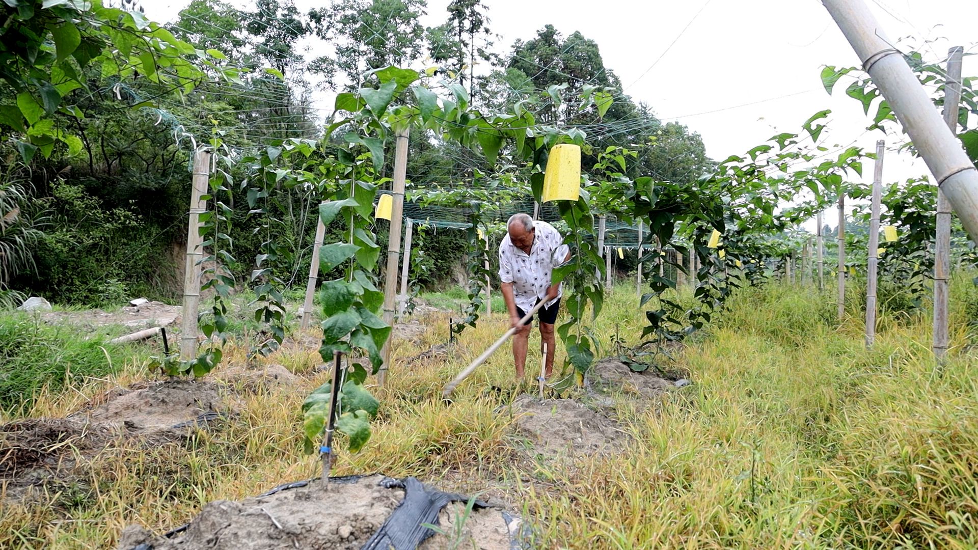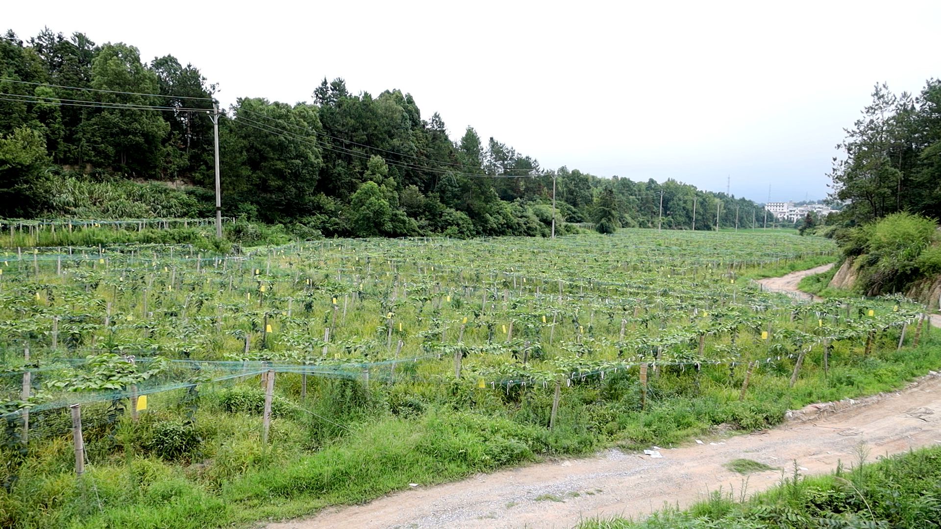 来到通城县石南镇石马村,只见山脚的田地里,一大片绿色的果藤长势良好,连片的搭架绵延在山脚下,生机勃勃,一派绿意盎然。