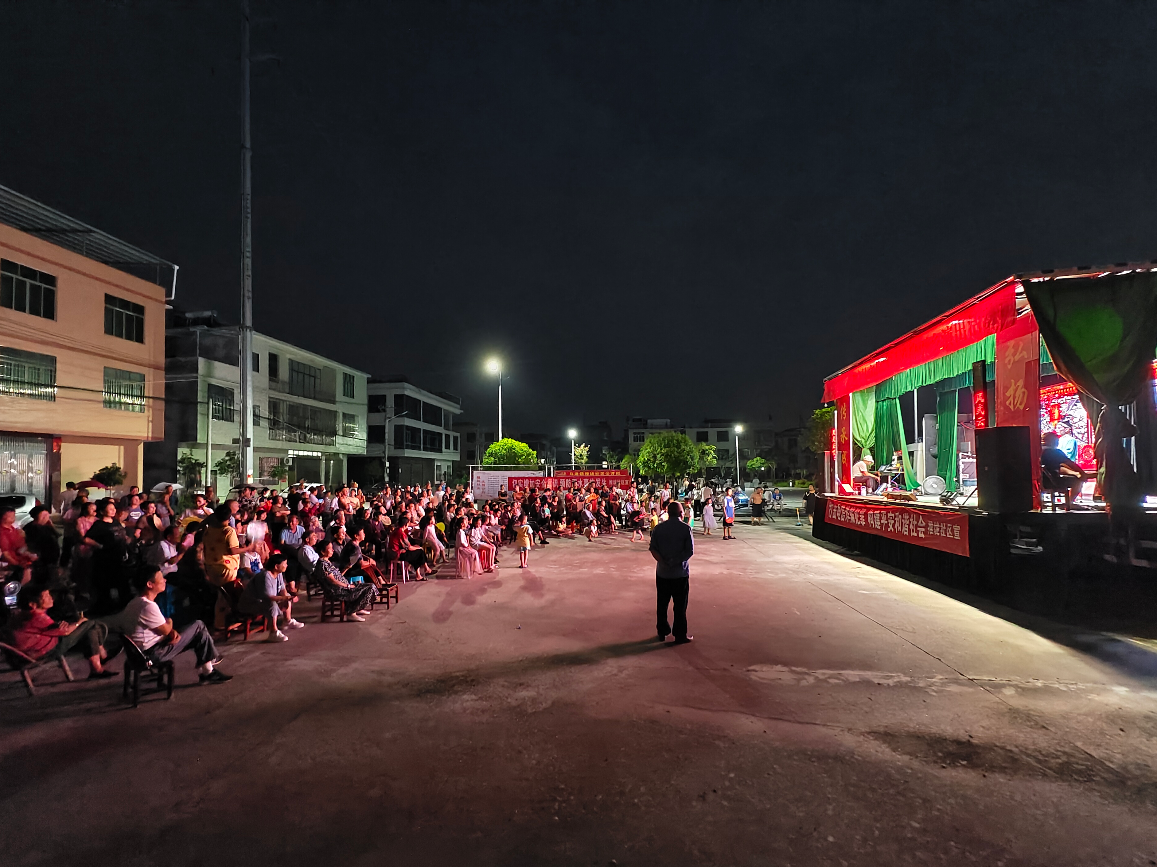 演出还未开始,村民们就已自带椅凳早早地来到演出现场等候,休闲广场上人头攒动,一片热闹景象。一个独具地方特色的《全民反诈骗》小品拉开了演出帷。
