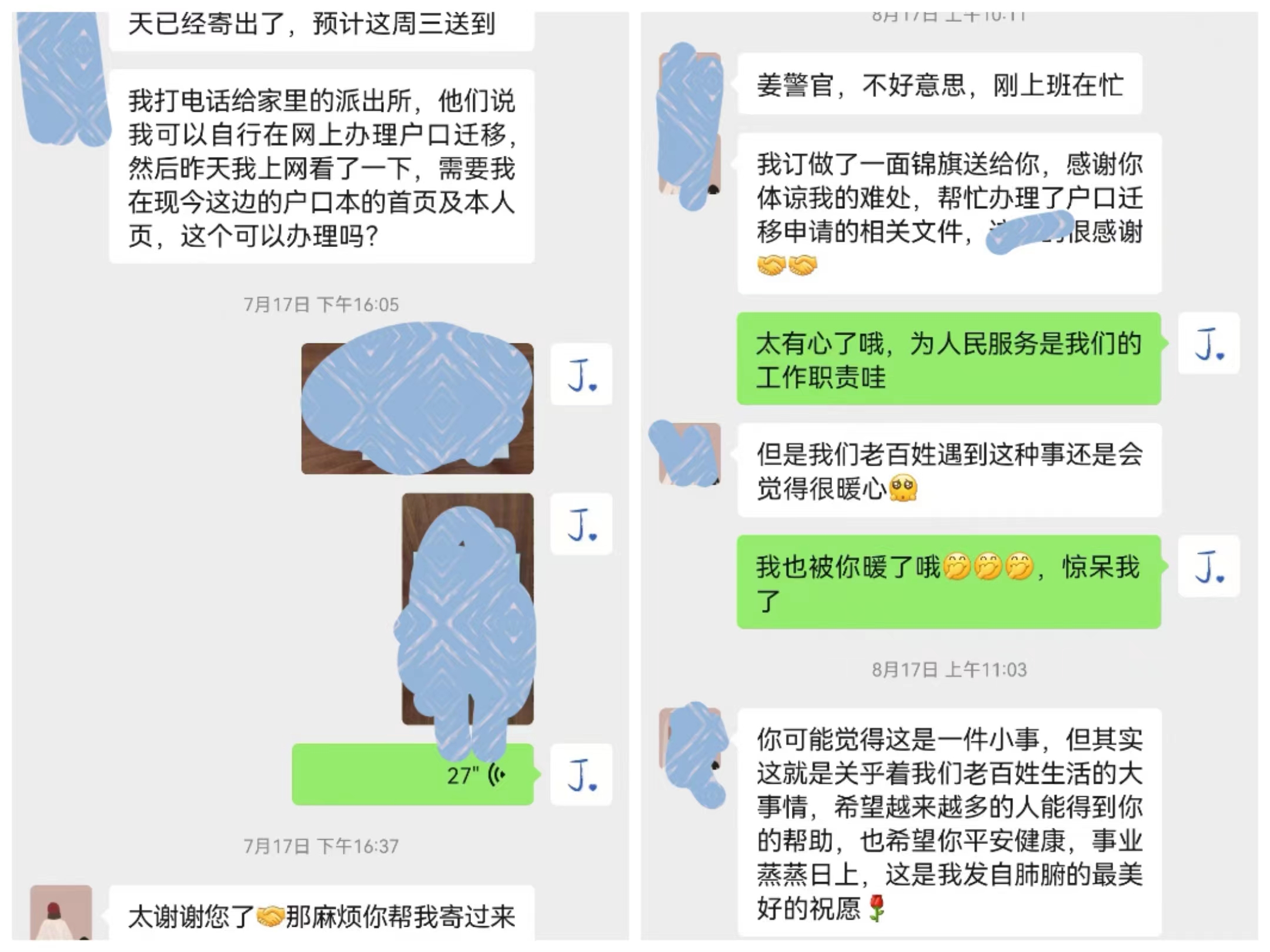 “你可以不用到窗口来,只要把办理业务需要的相关材料准备好,邮寄到我们派出所,这边审核后如果资料齐全就可以帮忙为您办理……”户籍辅警姜广丽耐心细致地告知其办理手续,随后添加了朱女士的微信,将办理迁户口的相关材料清单在微信中一一列出。7月底,姜广丽便收到了朱女士寄来的迁户材料,经过审核材料齐全,当日就为其办妥了迁户手续,并将办结材料邮寄给了朱女士。