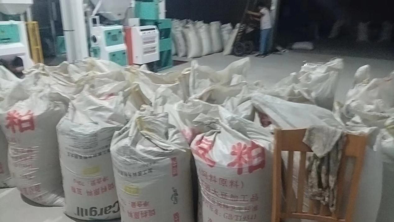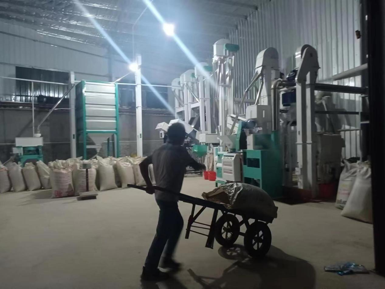 工人们正将新收的稻谷倒入大米加工设备内进行加工,稻谷经过初筛、脱壳、谷糙分离、精筛、称重等工序,再经机器包装,一袋袋成品大米即可出厂销售。