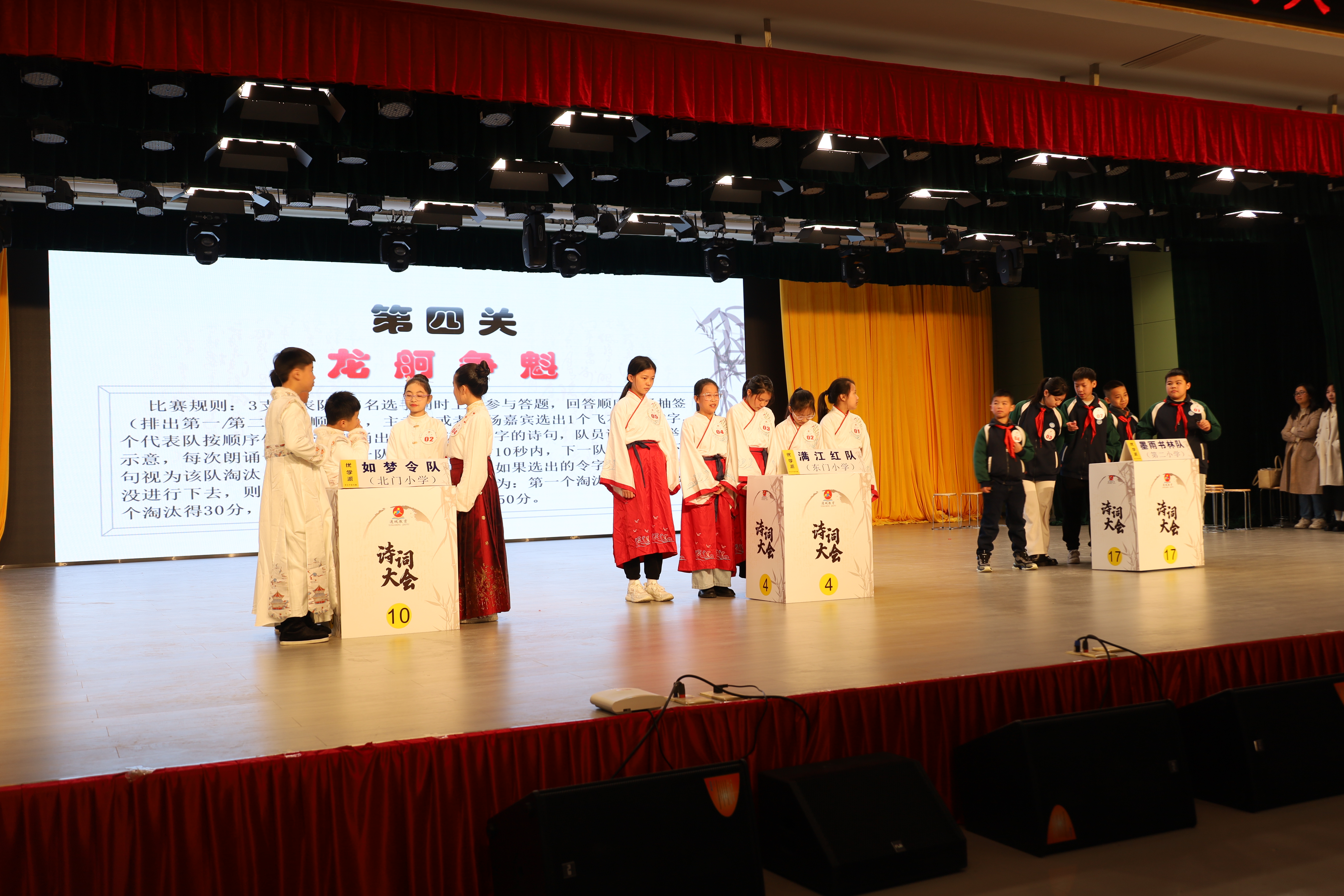 决赛现场设置了同舟并进、大浪淘沙、百舸争流、龙舸争魁四个环节,意在考查学生对诗词的熟记程度、观察力、诗词储备及书写等方面的能力。整场比赛,竞争十分激烈。其中,“百舸争流”抢答环节设置了选择、填字、对句、问答等风格各异的题目,不仅比脑力,还比手速,让台下观众揪着心、捏着汗;“龙舸争魁”中“雨”字飞花令PK更是点燃现场,将气氛一次次推向高潮。