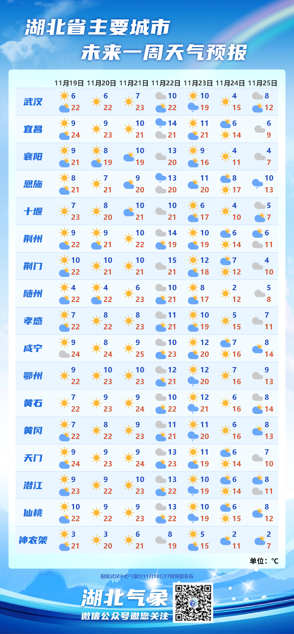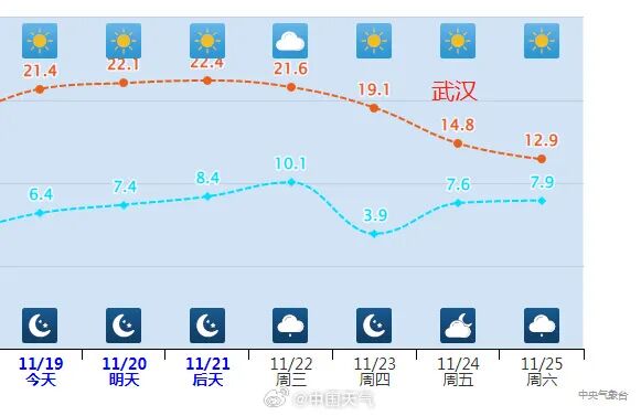下周三(11月22日)起湖北各地开始降温到下周末多地最高气温下降10℃以上