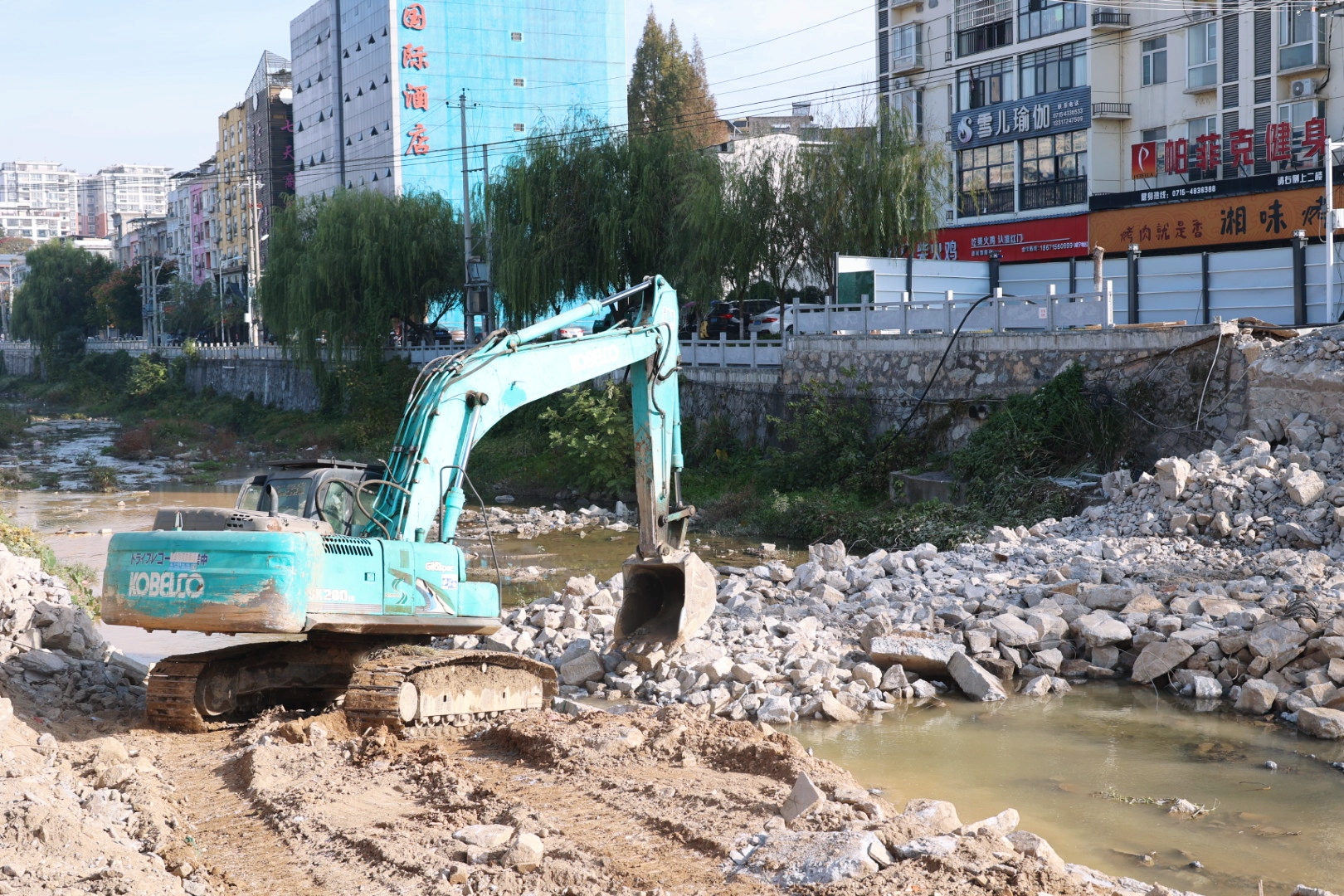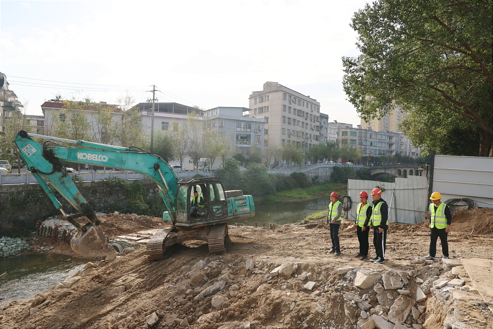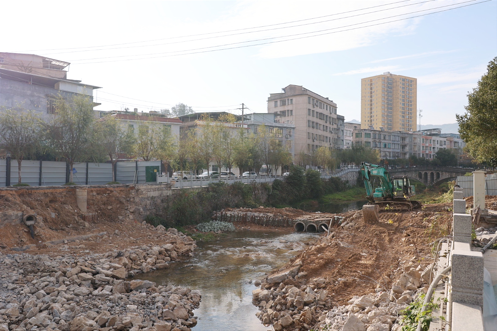 11月22日,记者在通城县东阁二桥改造项目现场看到,施工人员正操作机械对旧桥梁碎石进行清理,项目区内河流改道和污水管网改造也正在紧张进行,建设者们抢抓当前晴好天气,全力推进桥梁工程建设。