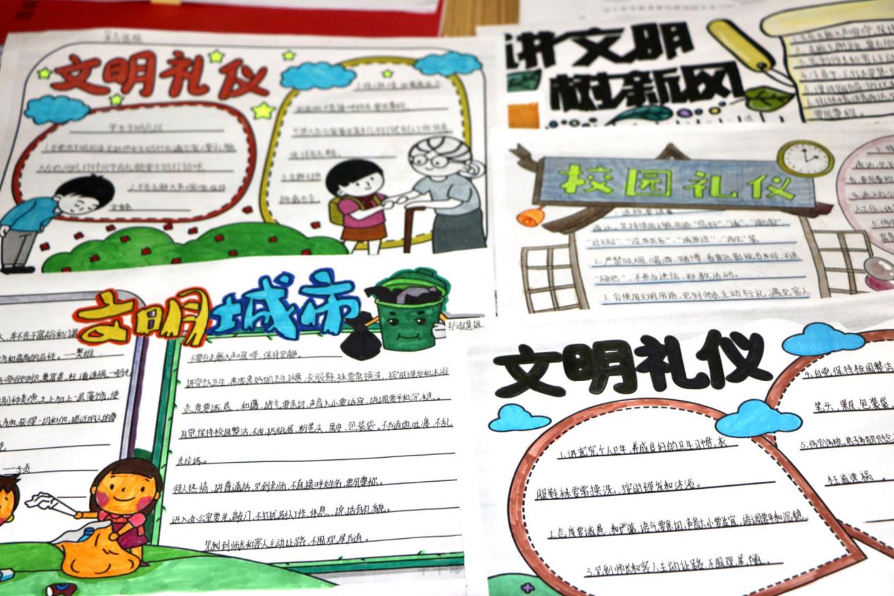 课间,学生们争做文明礼仪之星,主动纠正同学的穿戴,制止各种不文明的行为。从此,校园里懂礼节的多了,主动打招呼的多了,讲礼仪的多了。此外,学校还进行了“小红袖轮值”、文明之星、文明班级和手抄报评选等活动。