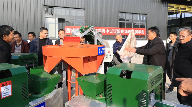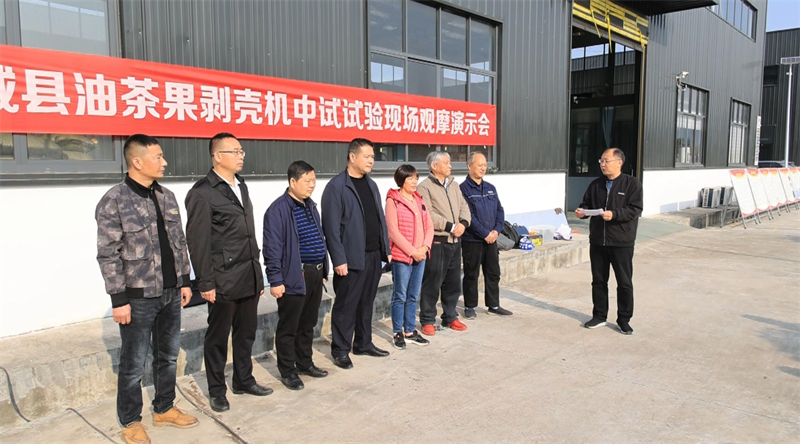 在油茶果剥壳机演示会上,油茶种植户们现场观看了油茶鲜果从分选到脱壳的机械化作业全过程。大家边看边问,深入了解机械化生产带来的效益提升,相互交流油茶种植经验。在随后举行的培训会上,来自湖北工业大学农机工程研究设计院的王焱清教授详细介绍了油茶果机械脱壳运行原理和国内油茶果深加工发展趋势。