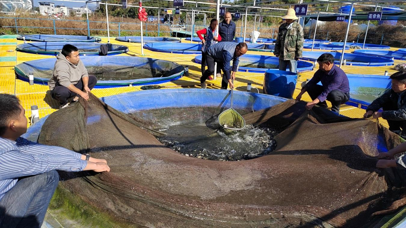 “此次我们共计卖出3万斤鱼,其中花骨鱼1000斤、江团800斤、彩虹鲷700斤、中华倒刺鲃500斤,带动村级集体经济增收6万元。这种高密度生态养鱼的新型养殖模式便于精细化管理,圆池内的供氧设备,让池中水流形成漩涡式循环流动,增加了鱼的运动量,缩短了养殖周期,既降低了成本,又提高了养殖效率。”五里村党支部书记黎星表示。