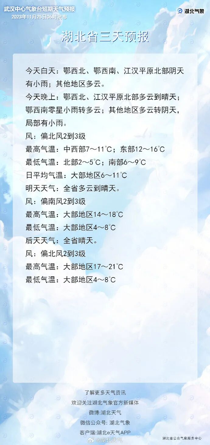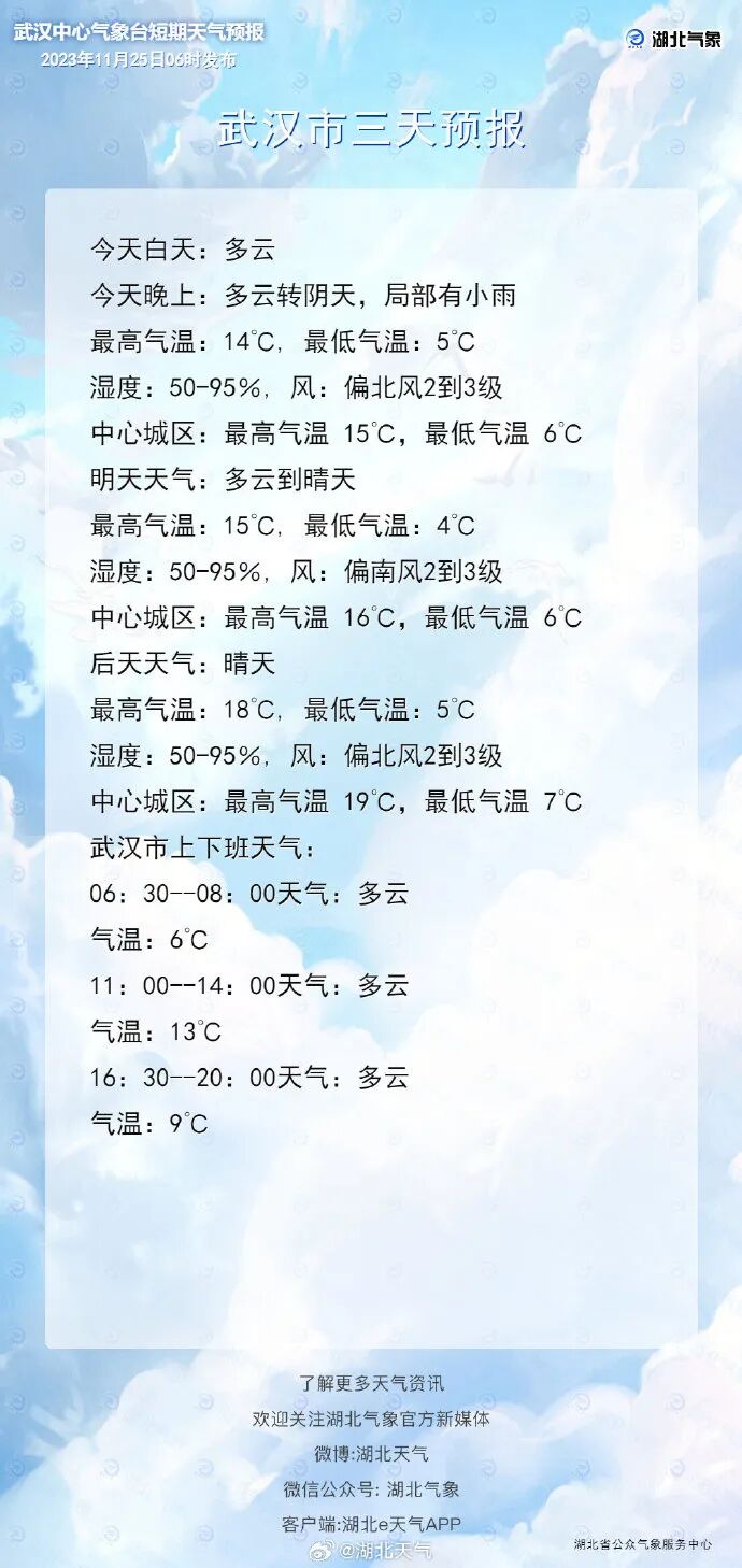 据湖北气象局最新消息,明后两天,雨水停歇,省内大部分地区转为多云到晴的天气,明天中西部地区气温上升明显,大部分地区高温将达14~18℃。后天,全省转晴,气温还会继续上升,高温将达17~21℃。