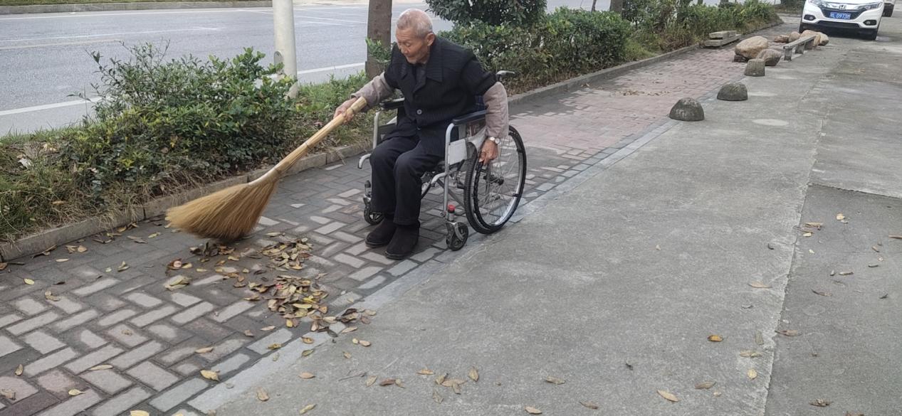 井堂村十一组村民葛先应,现年82岁,早年因疾病导致腿部行动不便,需依靠轮椅活动,在这种情况下,他不仅定时清扫自家房前屋后垃圾,还会在能力范围内清扫公共环境区域,将老一辈的优良传统表现得淋漓尽致。