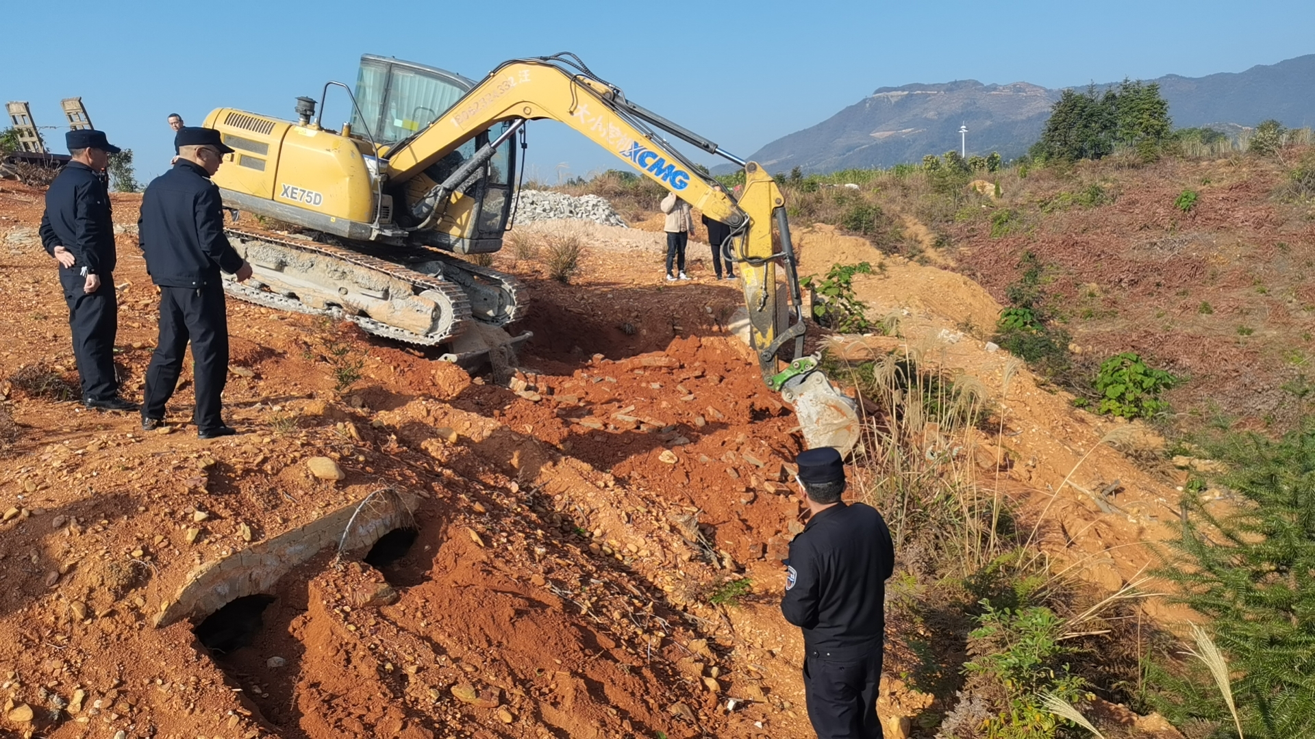拆除现场,随着挖掘机操作,一座座活人墓相继倒塌,违建墓地整治拆除顺利完成。此次行动共对17座“活人墓”进行捣毁和土地掩埋平整。