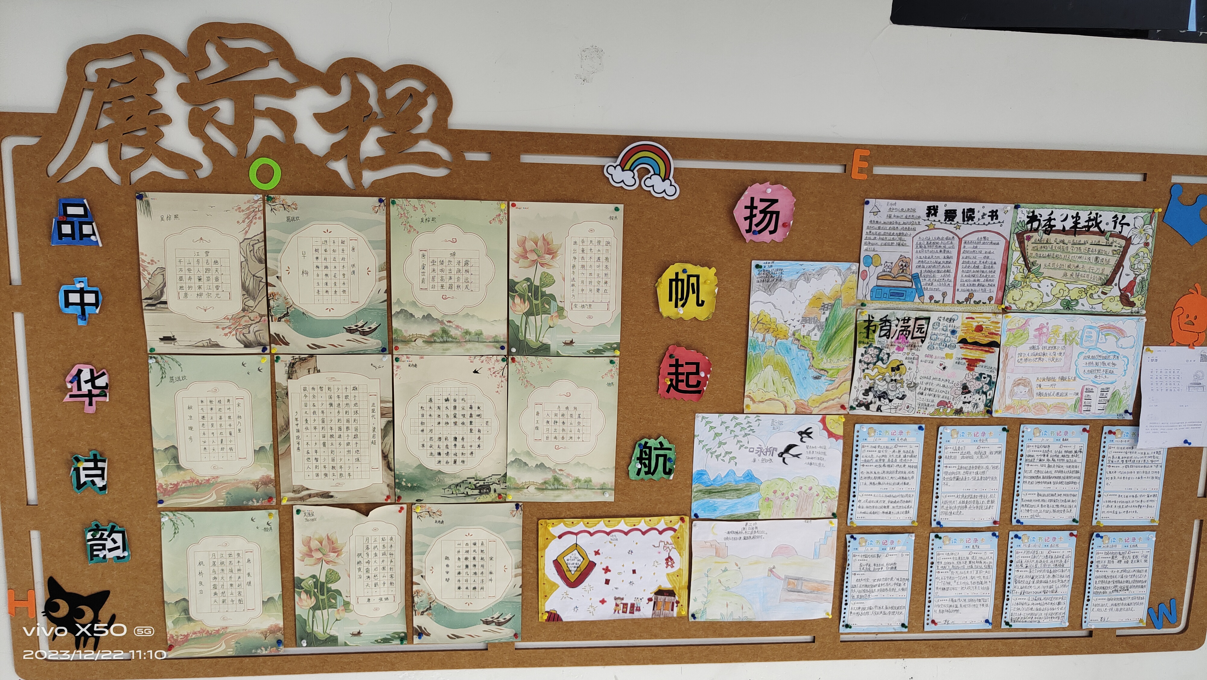 有的班级积极弘扬优秀传统文化,以“吸取诗词精华,做气质少年”为主题,在班级文化长廊上设置了古诗积累和古诗卡的展示,让学生在古诗词中感受优秀传统文化的古韵古香。“透过这些诗词,我们在嶙峋苍岩间,看到了坚毅的品格;在遒劲枝干间,看到了挺拔的傲骨;在笔意挥洒间,看到了不屈的意志;在简练清雅间,看到了超脱的从容。”老师向正在观看的同学们讲道。