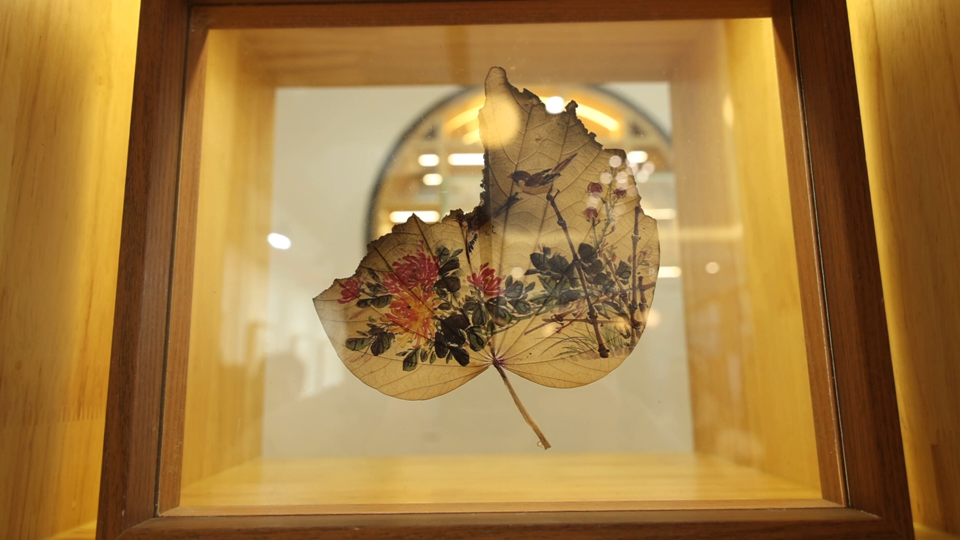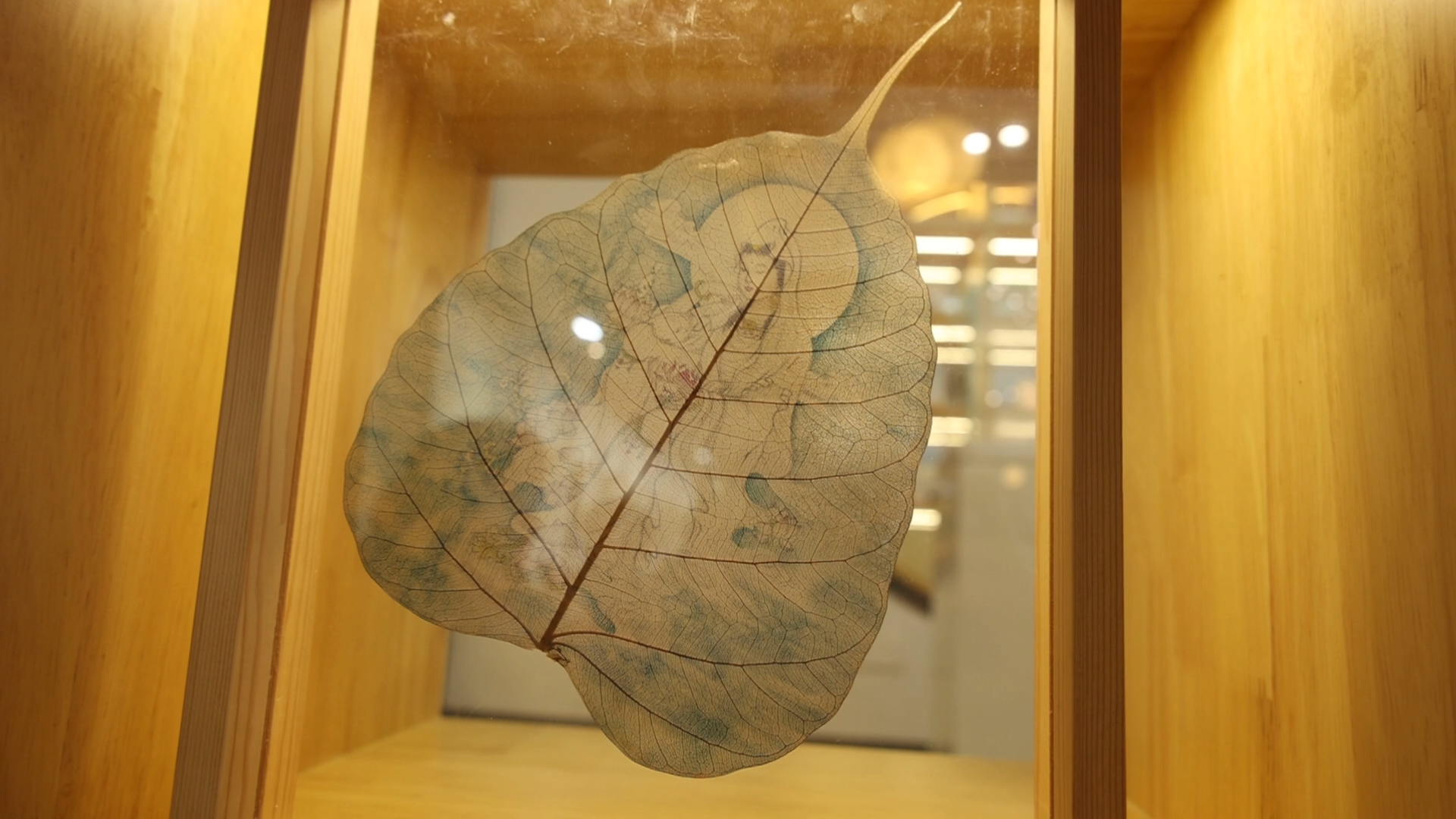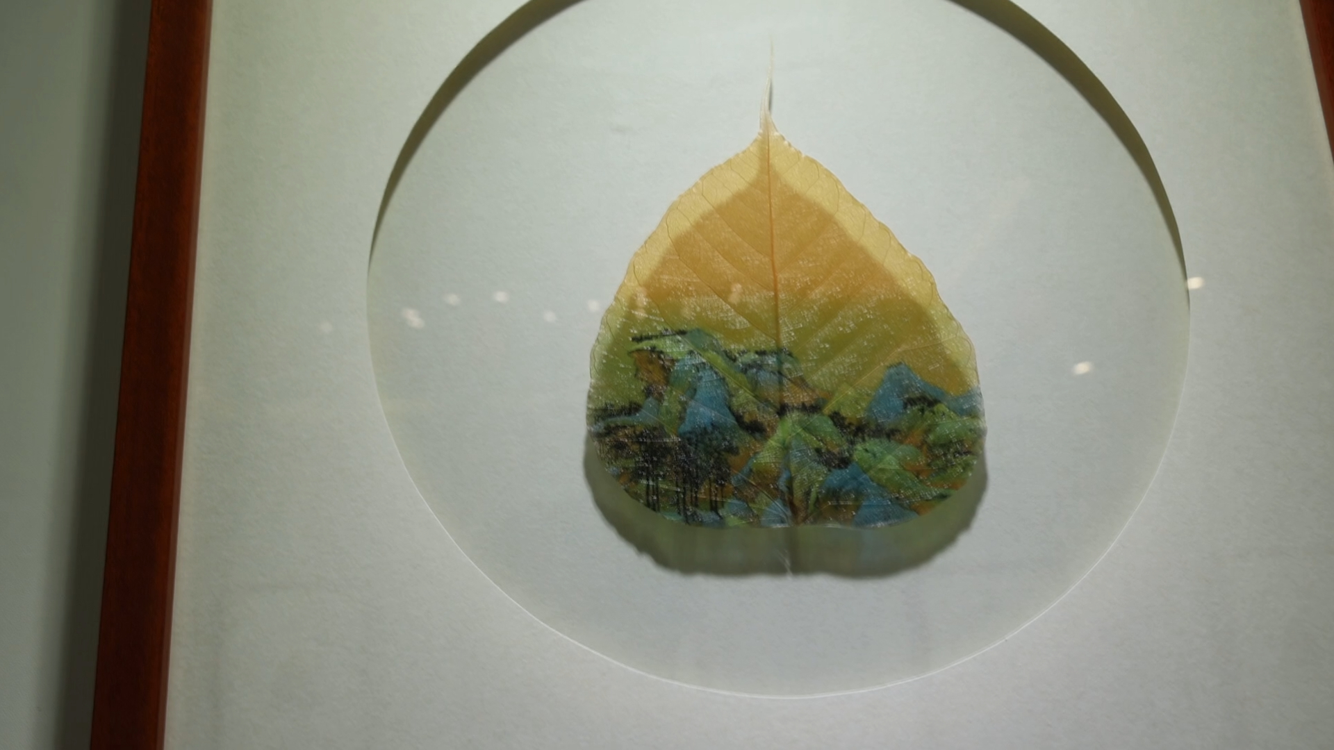 画展现场,一幅幅精美的作品展现在观众眼前。一片片树叶叶脉清晰,但透过光可以看到,叶片上有千里江山、观音送子等,叶片上的山水层次分明,线条流畅生动,颜色古朴自然。
