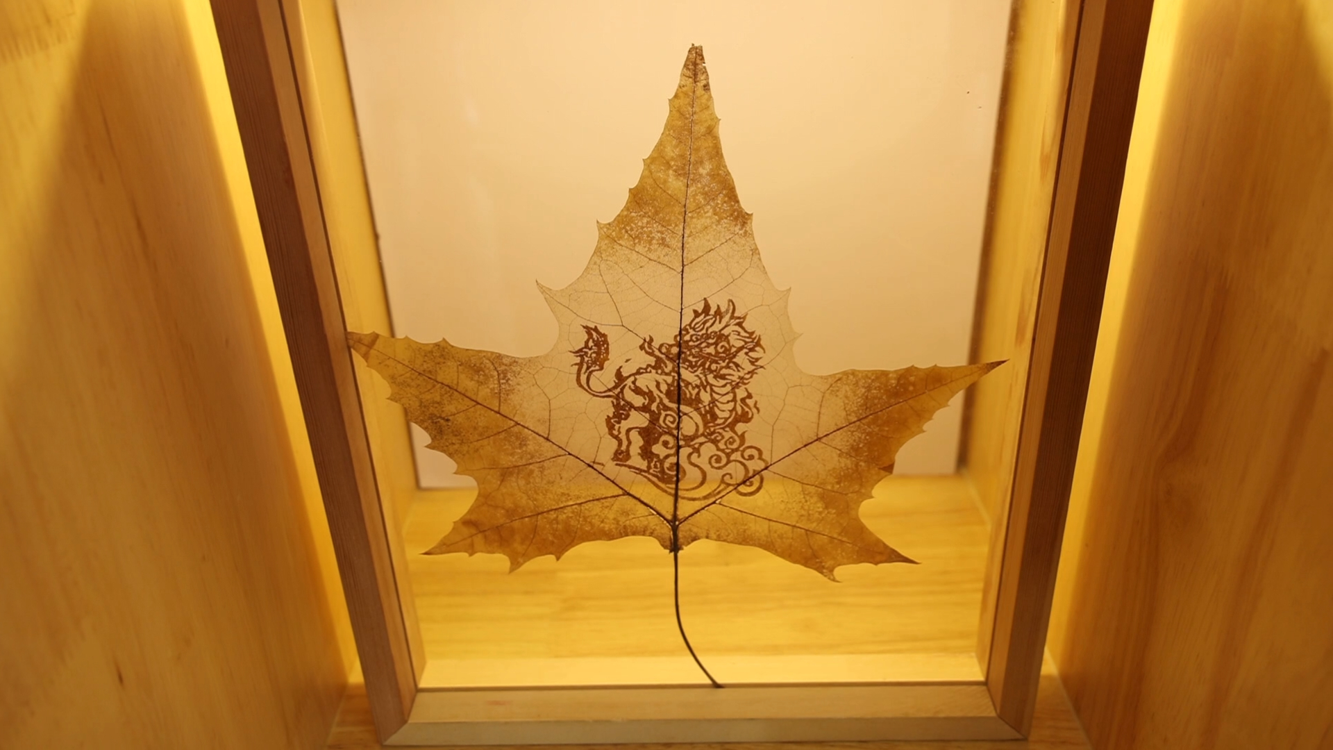 丁力向观众介绍叶画的制作方法及其原理,主要原材料树叶是从云南大山里精选的菩提叶或者玉兰叶,经修剪、浸泡、锤压、雕刻、研磨等60多道工序,运用绘画、刺染、微刻等方法,至少2到3个月才能制作成可观赏和收藏的作品。制作过程中,他融入古法纹饰、蜡染和叶雕技艺,使得色彩在叶片上表现更为丰富,并且可以永久保存。
