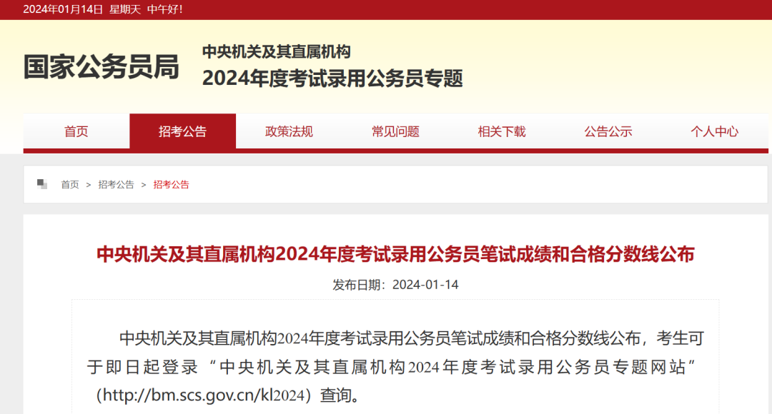 中央机关及其直属机构2024年度考试录用公务员笔试成绩和合格分数线公布,考生可于即日起登录“中央机关及其直属机构2024年度考试录用公务员专题网站”查询。