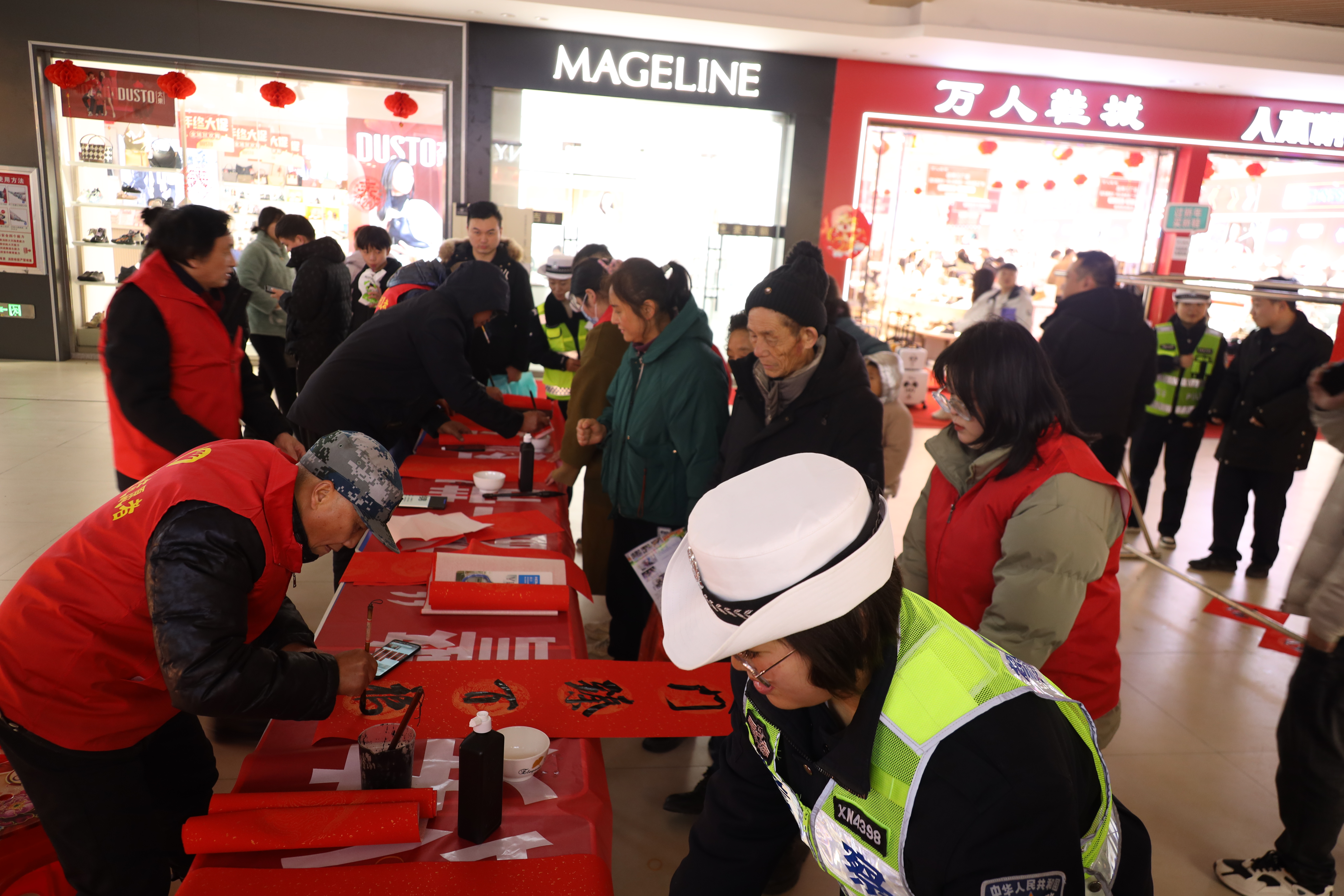 活动现场,气氛热烈,翰墨飘香,书法家们凝神静气,笔走龙蛇,将一幅幅大红福字、对联呈现在大家的面前。交警和文明交通志愿者们忙前忙后讲解寓意,将写好的春联整理后送给过路群众,并现场宣传平安交通小知识,提醒大家在春节出行时注意安全,把“祝福”和“安全”装在心上。