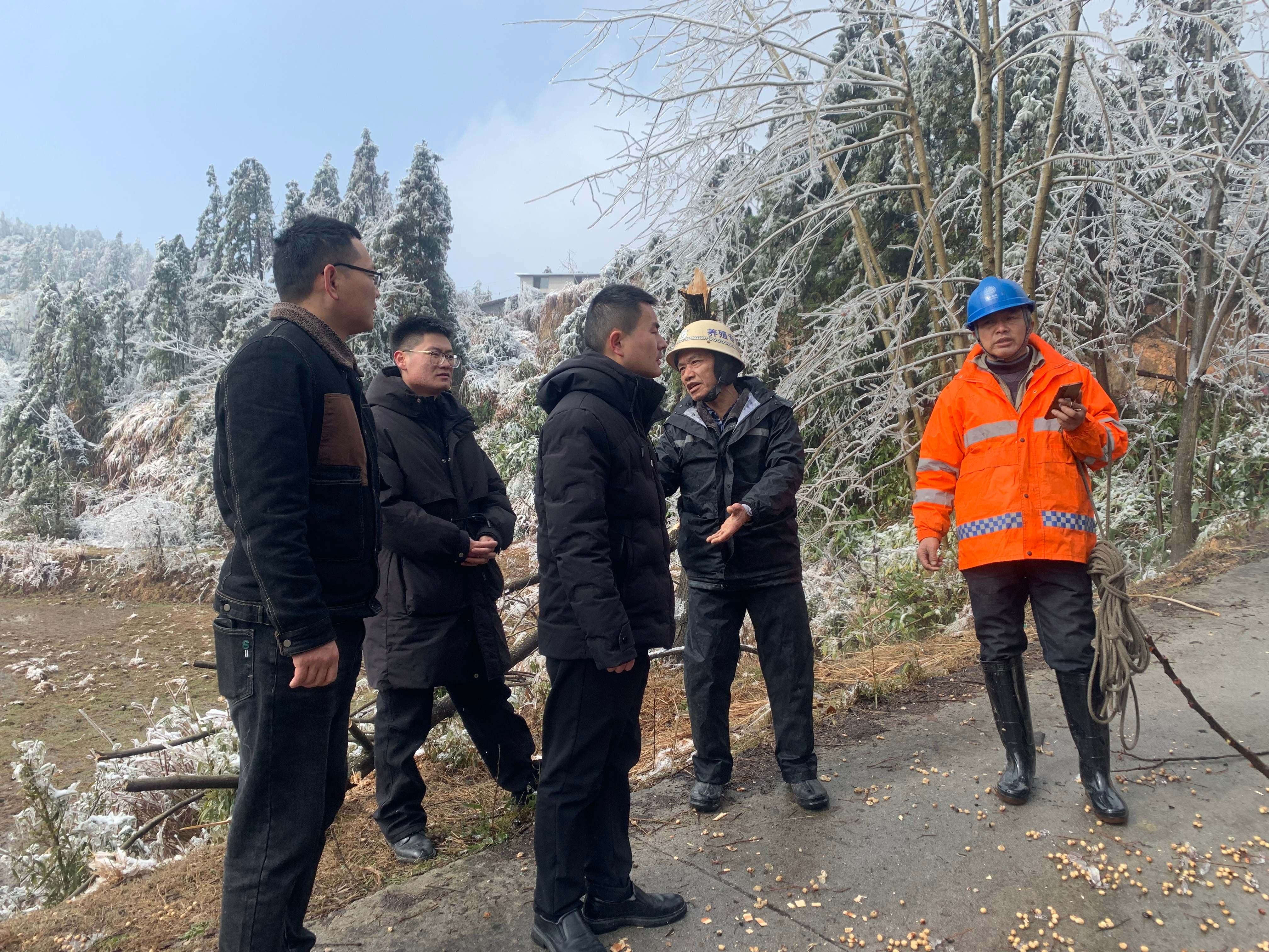 张四平便和徐石球及村民志愿者们分头行动,动员附近居民清理道路两边山坡上倒下来的竹子,敲掉导线外裹着的厚厚的冰柱。他们不断动员村民齐心砍竹、挖坑,重新填装电杆,通电工程进度一步步被推进。清理完冰竹,爬过陡坡,重新填装好电线杆,时间已经过去了9个多小时。