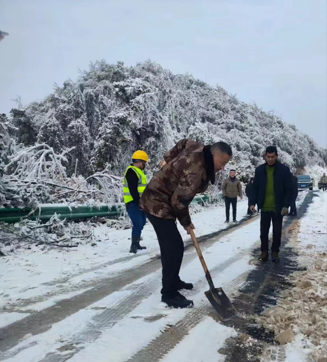 山路蜿蜒坡陡、结冰严重、湿滑难行,且只有一车宽,张四平和徐石球等人在山路骑着山地摩托车,为抢修车装上防滑链,小心翼翼行驶在山路上,途中不断遇到倒伏拦路的竹障,他们便手持砍刀清理,清理完后再启程。抢修队伍穿过一条条又陡又窄的山路,仔细巡视受灾情况,发现山上的电线杆有三根发生不同程度倾斜,多处导线伏地。