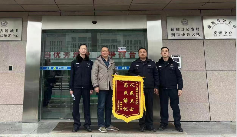 2月9日晚,通城县公安局刑侦大队民警抓获一名拉车门盗窃人员。目前,该嫌疑人王某已被公安机关依法予以刑事拘留,涉案财物也已悉数返还被害人。2月15日,受害人为办案民警送来一面印有“人民卫士,为民解忧”的锦旗来表达感谢之情。