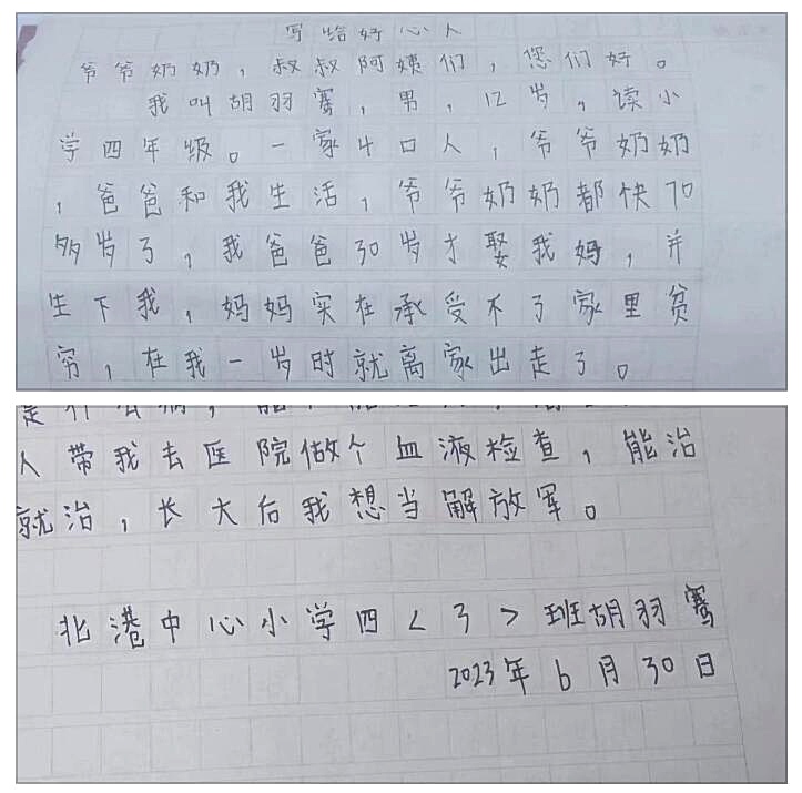 2023年6月份,胡羽骞抱着试试看的心理,向北港镇党委政府写了一封求助信。北港镇党委政府工作人员走访了解情况后,第一时间向其伸出援助之手,主动帮助他申办了残疾人救助,多次给予爱心资金帮扶,并为他联系了相关医院进行治疗,发动学校减免他的生活费、托管费等,确保他治病上学两不误。