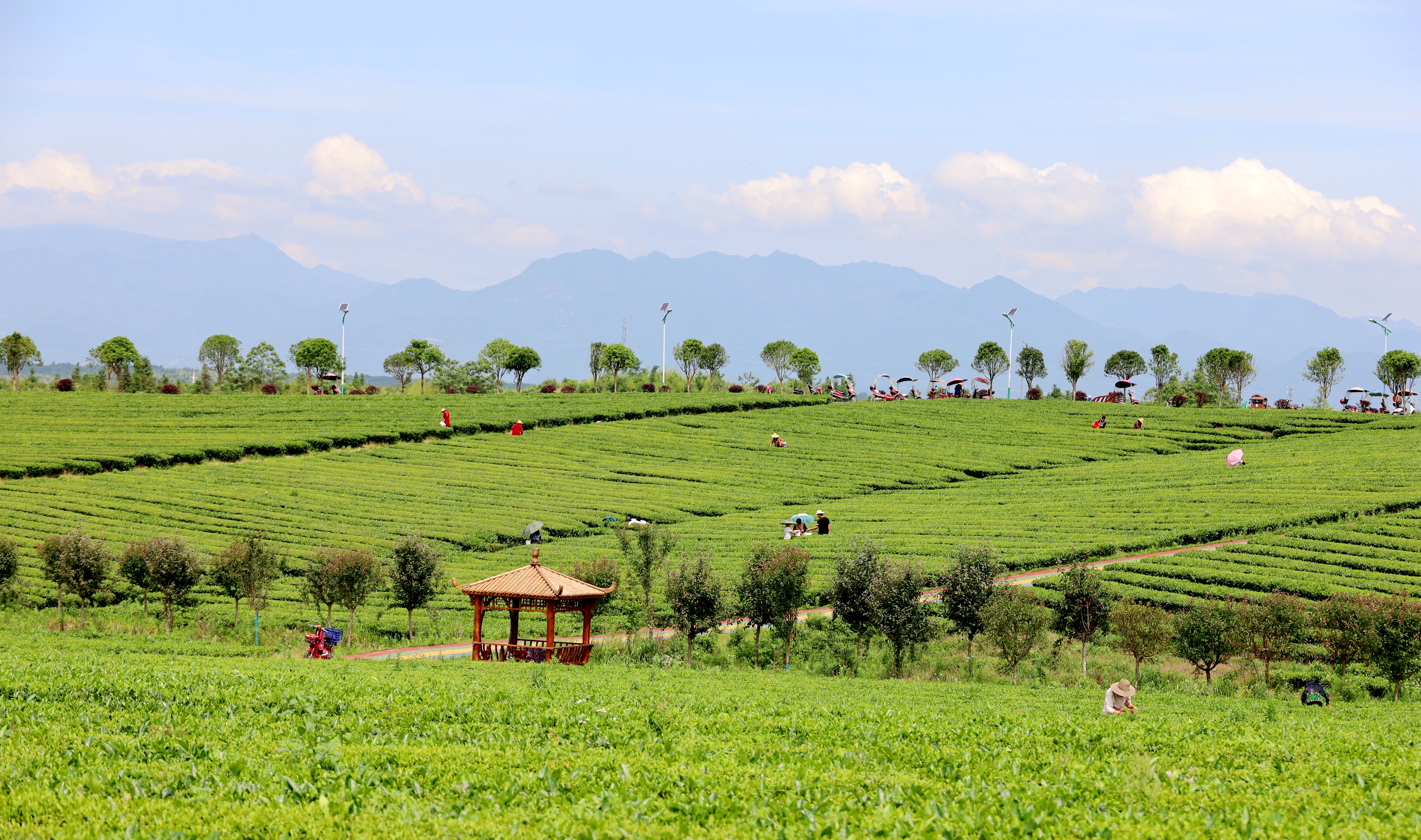 在离沙堆茶厂不远处大柱山茶厂,每天都有上百人在茶园中采茶。上午11点,茶厂收购处排起了长龙,工作人员忙着称重、记录、开票,现场满是热闹景象。茶农们拿着票据,当场就可以领到工资,辛苦的劳作有了收获,她们脸上洋溢着幸福的笑容。