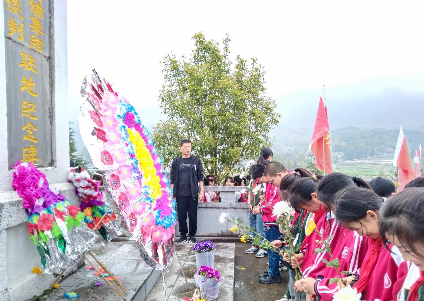纪念碑前,全体师生整齐列队,气氛庄严;少先队员们通过出队旗、唱队歌、讲尖山铺集结历史,向烈士敬献花圈鲜花、默哀、重温入队誓词、呼号、学生代表发言等一系列活动,表达了对革命先烈的无限哀思与崇敬,和继承先烈遗志的坚强决心。