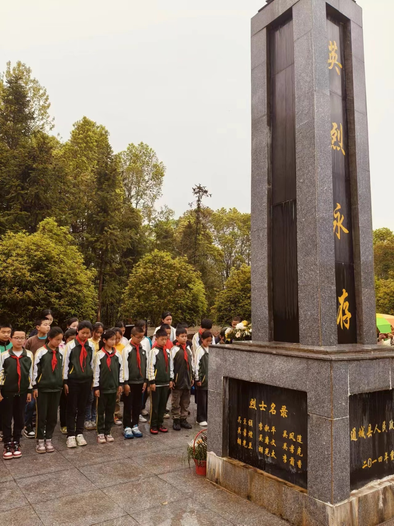 4月2日下午,天空下着雨,长垅完小的少先队员身着校服,佩戴红领巾,带着花篮来到了大坪乡铁路坪潘凤保烈士陵园前,祭奠长眠在这里的革命先烈的英灵,表达对先烈诚挚的敬意和深深地怀念!