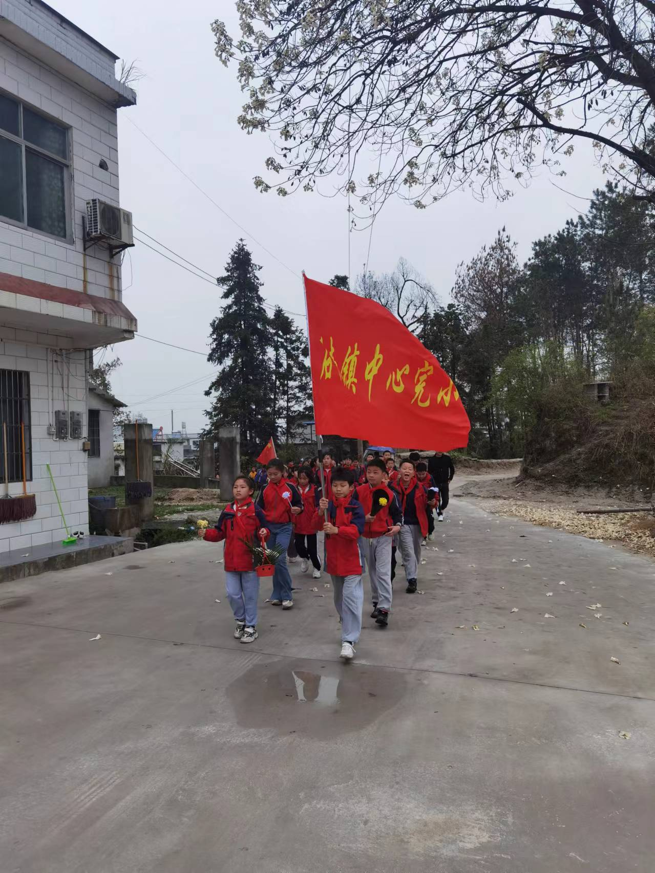 少先队员们手持花篮,高举校旗,向烈士墓方向行进。