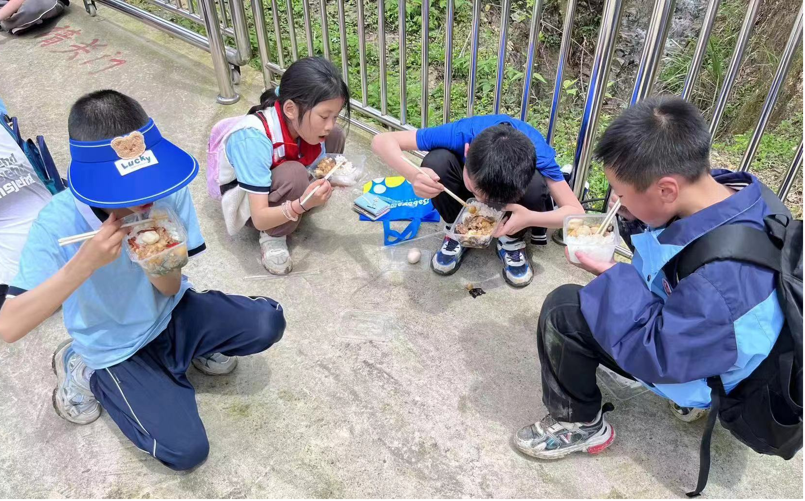 中午是四庄小学配送的爱心午餐,劳动后的饥饿让学生们狼吞虎咽。