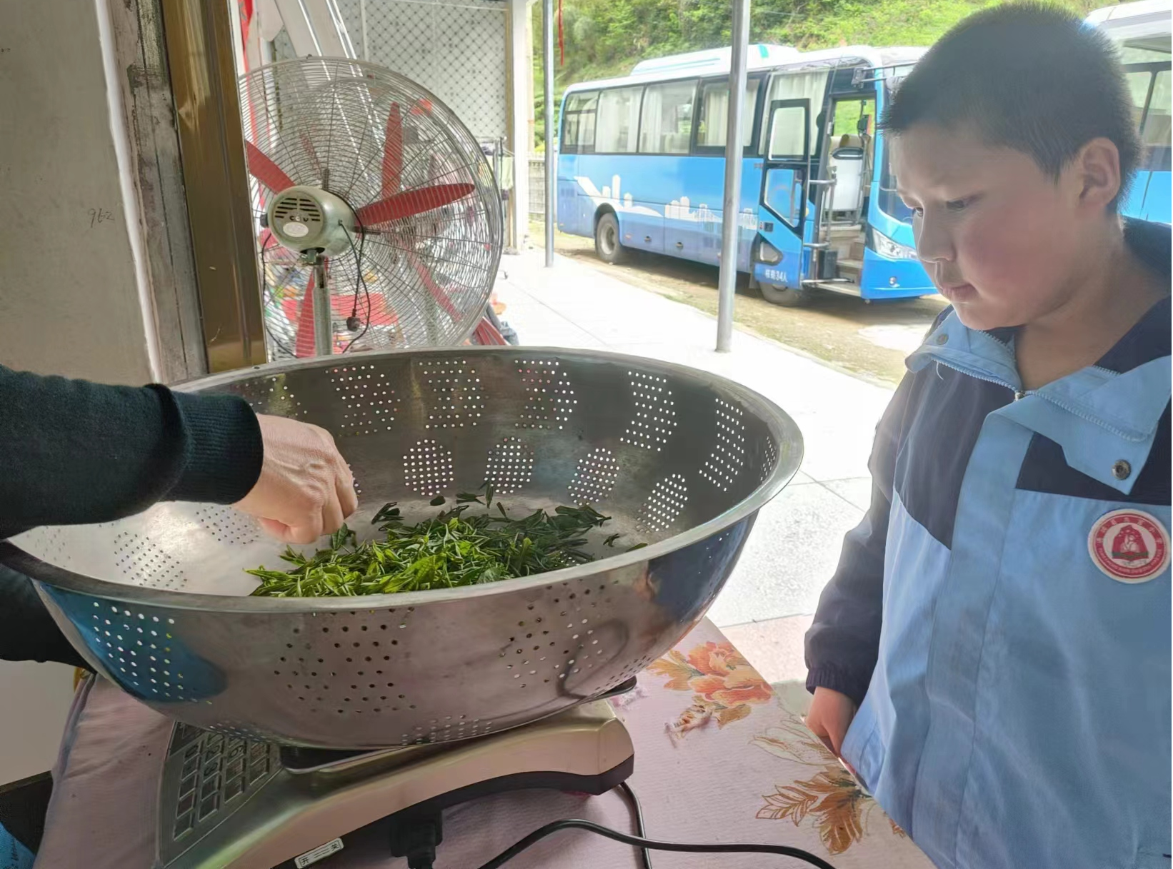 紧接着师生们拿着小篮筐来到采茶基地,在工作人员的指导下,他们学习如何辨认成熟的茶叶,如何轻柔地将其采摘下,他们将嫩芽采摘下来放入篓中,构成一幅青山采茶忙的劳动画面。在整个采茶过程中,同学们互相配合、精心挑选,最终收获了一筐筐碧绿的劳动成果。有的学生一上午采1元、4元,最多卖了8元,有孩子说:钱好难赚呀!