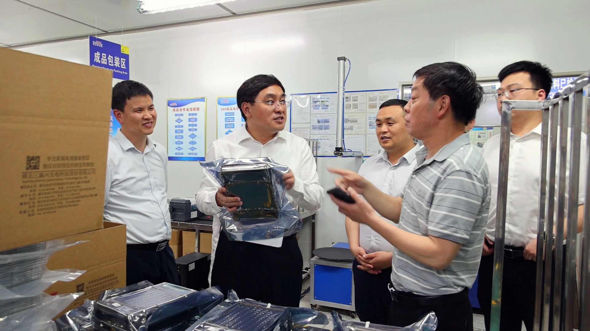 张廷一行先后前往湖北三赢兴光电科技股份有限公司、湖北黄袍山绿色产品有限公司、湖北瀛通电子科技有限公司、湖北平安电工材料有限公司等企业,深入产品展厅和生产车间,与企业负责人详细交流,了解企业生产经营、产品研发、科技创新以及发展规划等情况。