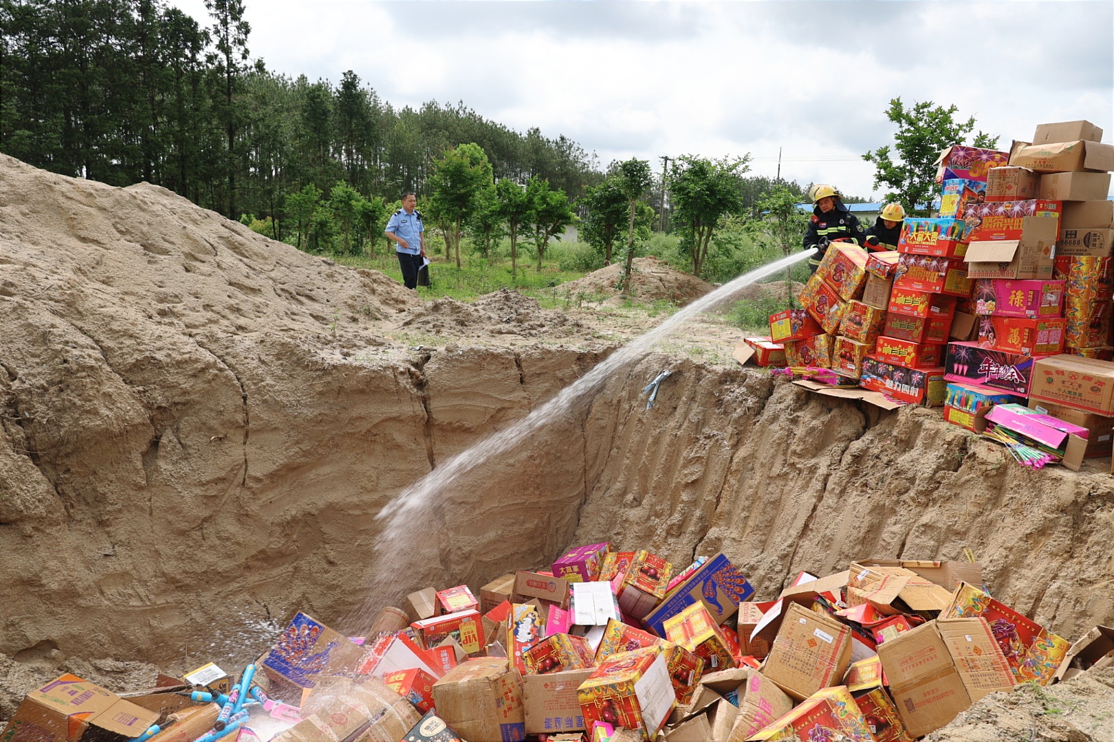 工作准备就绪后,工作人员将非法烟花爆竹放入提前挖好的深坑中,利用消防高压水枪对烟花爆竹进行洒水浸泡,并进行填埋。县纪委监委工作人员进行了全程监督,确保销毁工作依法依规。销毁工作结束后,工作人员还对现场进行了妥善清理和后续处理,确保安全无隐患。