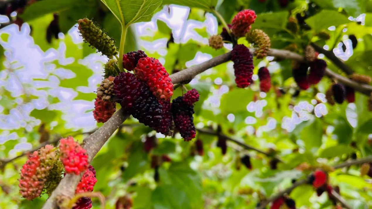 走进桑葚种植基地,只见一排排桑葚树葱葱郁郁、迎风飘摆。黑紫色和红色的桑葚挂满枝头、压弯了枝头,颗颗饱满紧实。基地内,工作人员吴素玲正忙着采摘成熟的桑葚。挑选、采摘、装盒,忙得不亦乐乎。