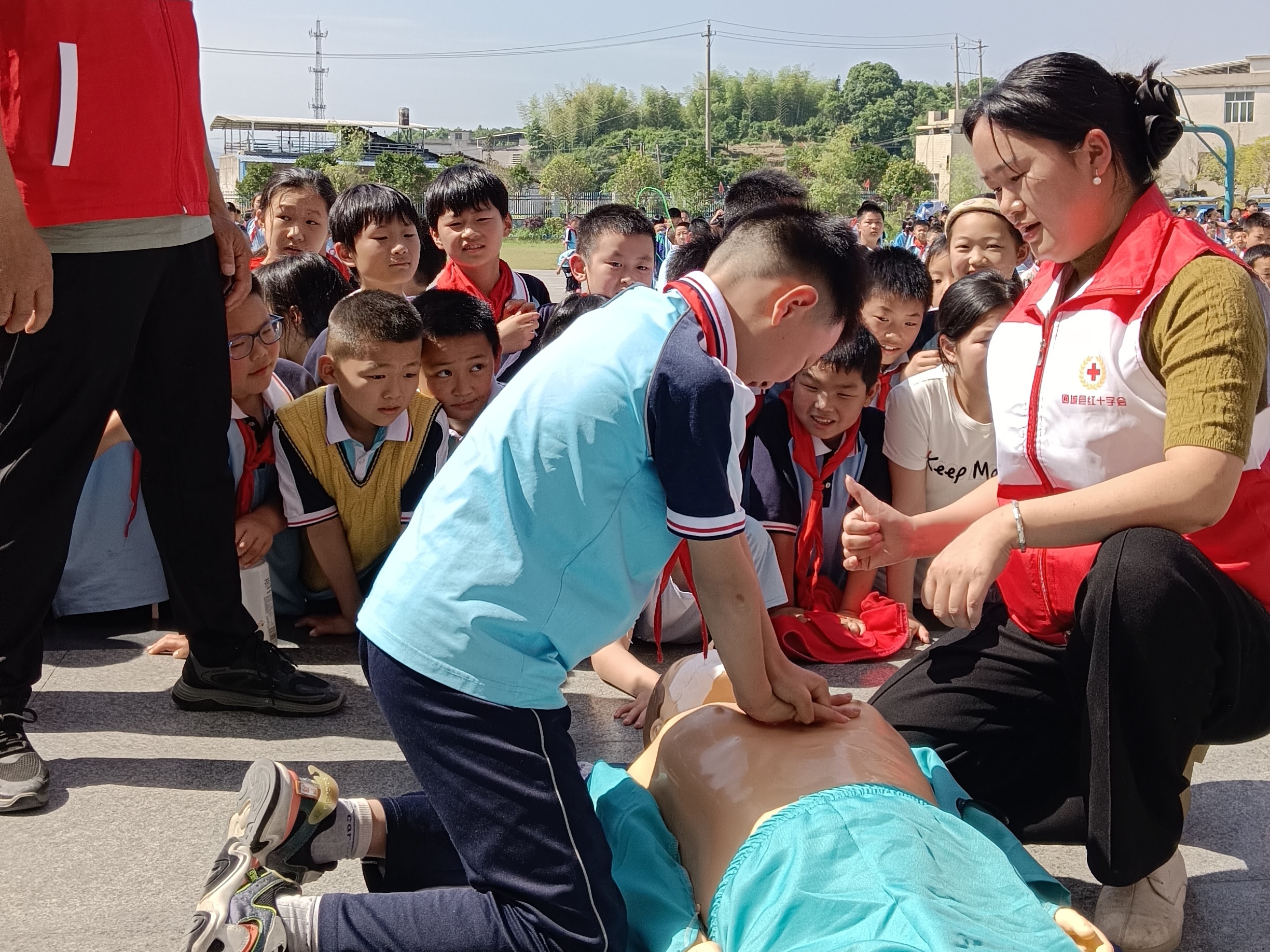 “第一步,清除口腔分泌物;第二步,人工呼吸……”旗台上,医护人员正向全体师生教授心肺复苏急救法的操作方法,孩子们看得异常认真,教师们也表示大有收获。师生现场演练,尝试心肺复苏急救操作。医护人员表明,心肺复苏期间必须争分夺秒,复苏越早,存活率越高。