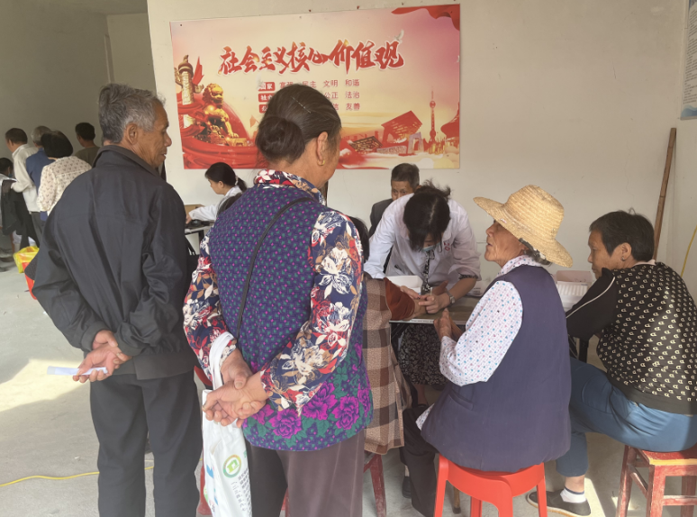 5月16日一早,坪坳村老安置点人群熙熙攘攘,好不热闹。现场14名医护人员耐心热情地为前来咨询的村民们免费提供疾病咨询、初步筛查、常见疾病预防知识科普等服务,同时开展测血压、做血常规、心电图、腹部B超等健康检查。