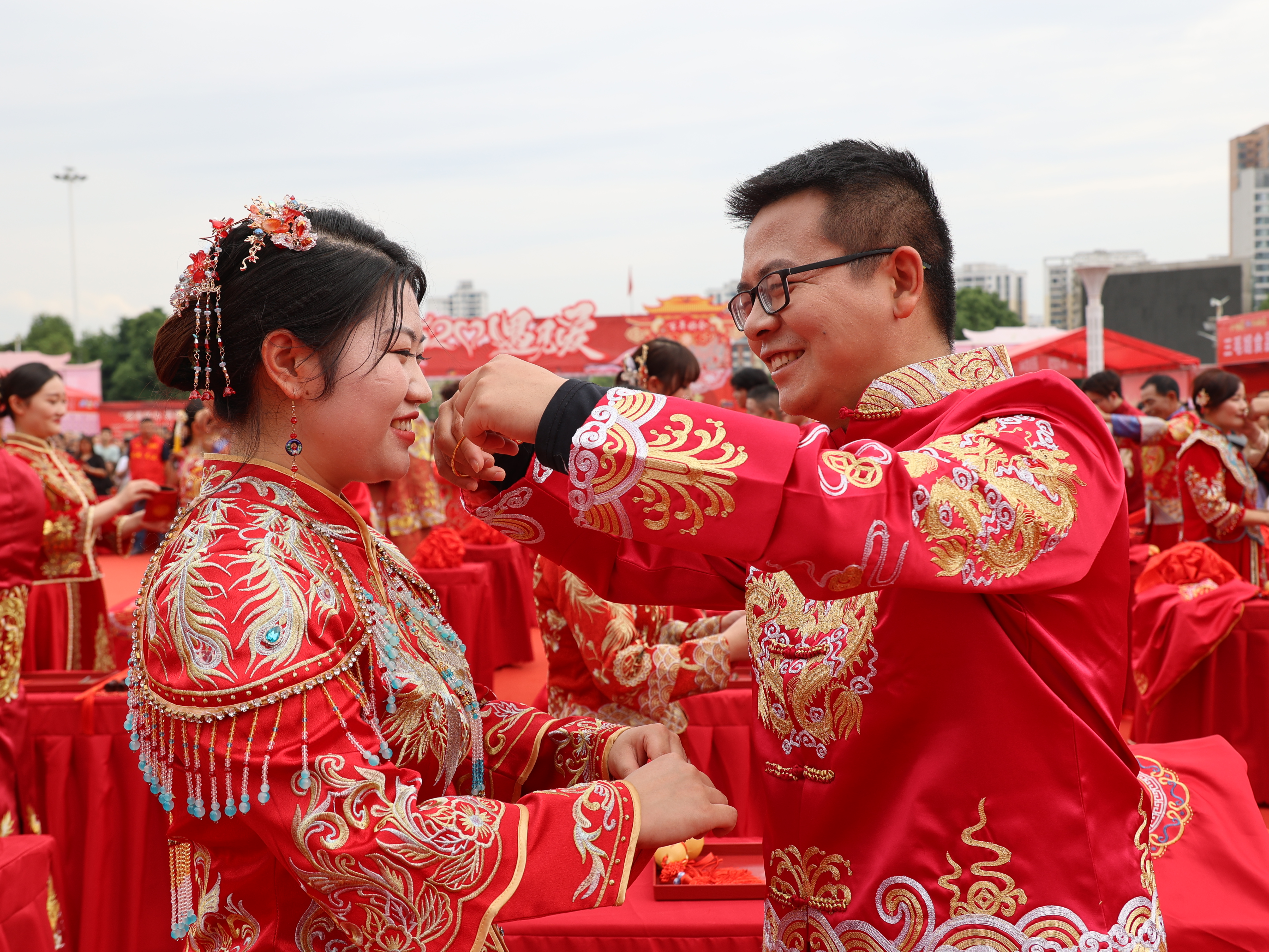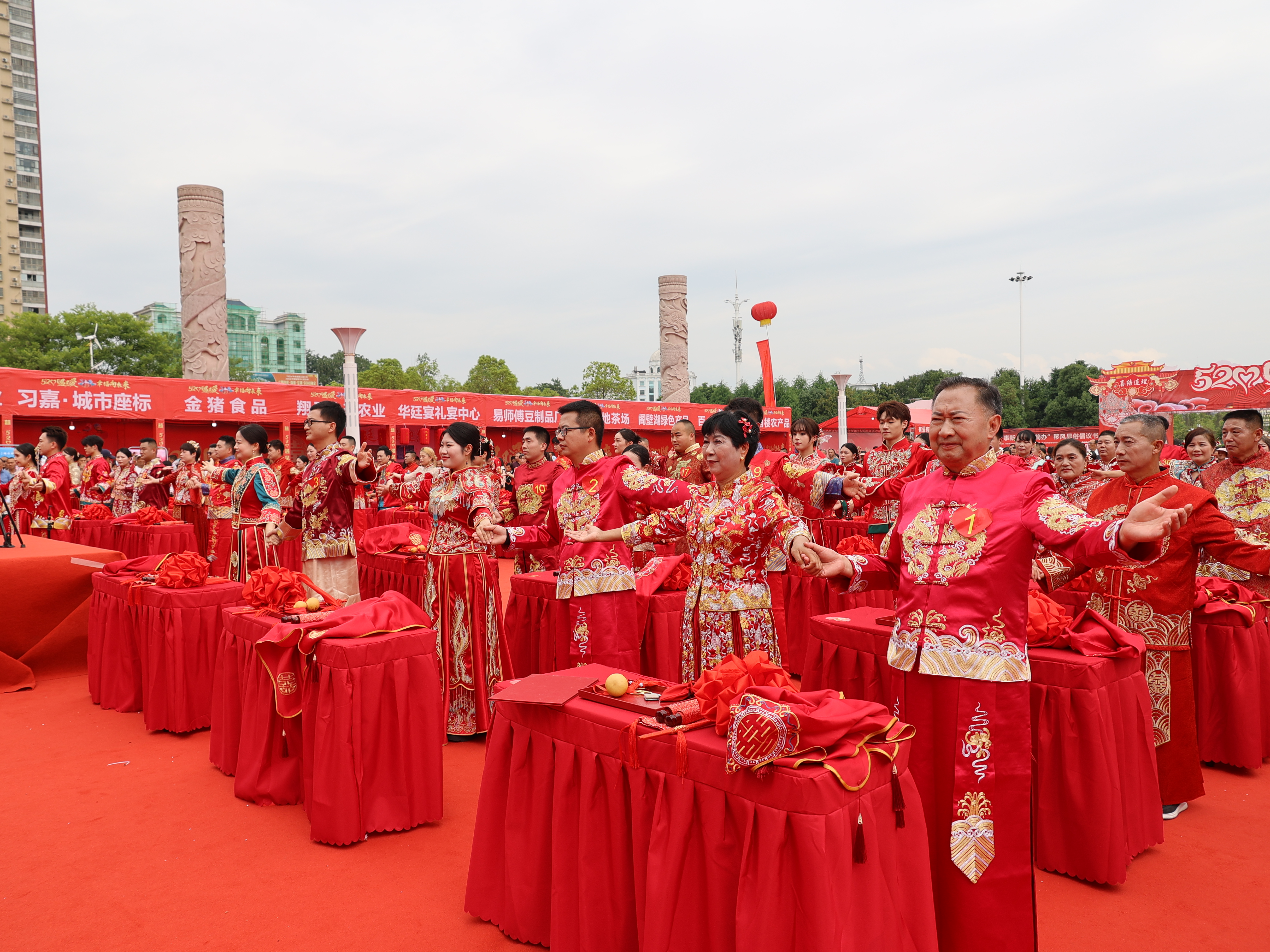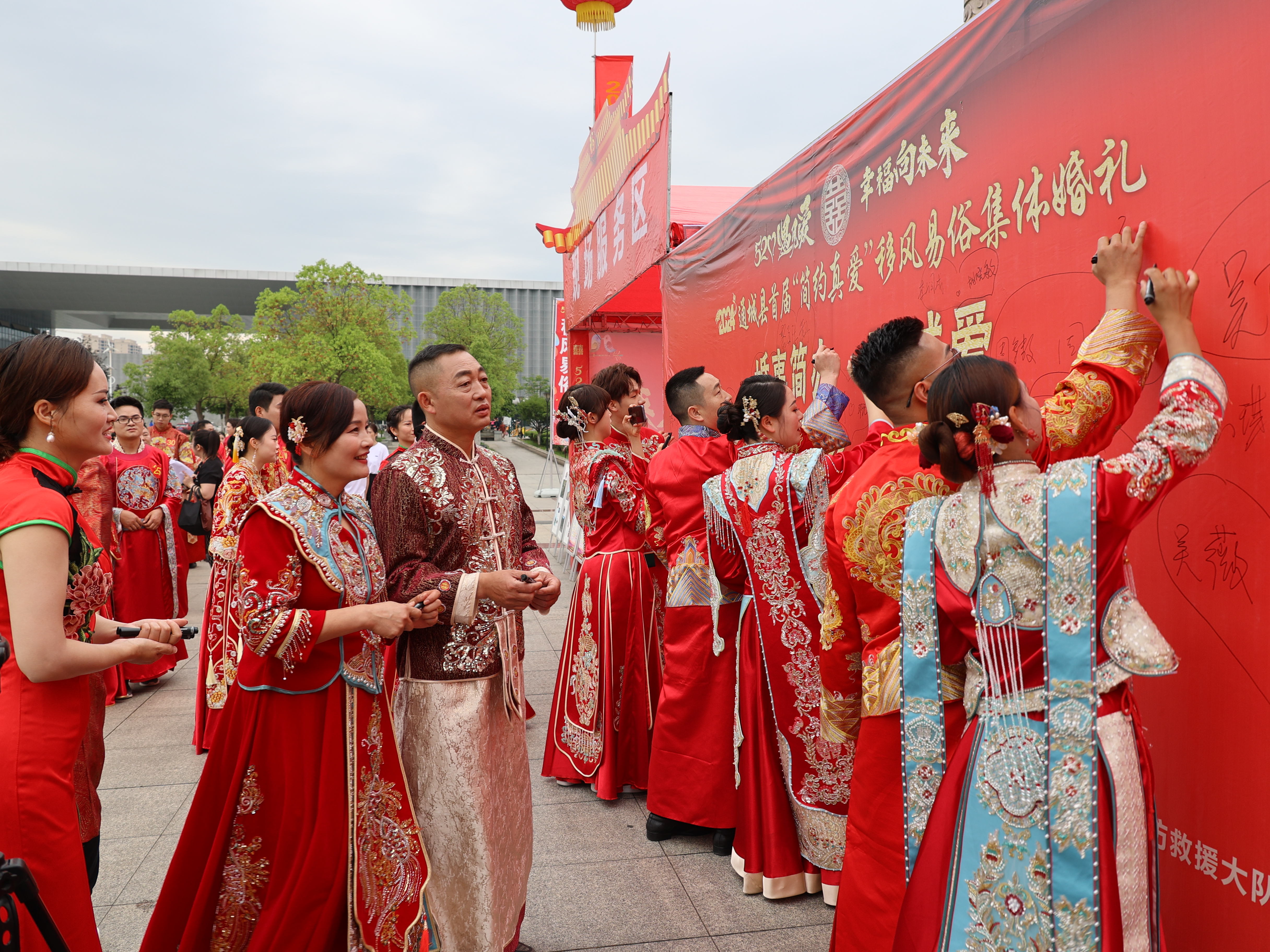 在观礼群众的见证下,40对金婚、银婚、新婚夫妻身着中式华服,共执红绸丝带,缓缓步入集体婚礼现场,共同完成夫妻对拜、合卺同杯、结发之礼、诺婚书、执手之礼等传统中式婚礼仪式,缔结白首之约、共盟鸳鸯之誓;金婚夫妇代表、新婚夫妇代表、模范夫妇代表上台发言并发出倡议,坚持移风易俗、婚事新办,倡导简约适度、现代文明的婚俗新风,抵制高价彩礼、铺张浪费、低俗陋习等不良风气,争做新“婚”尚的倡导者、践行者、推动者。