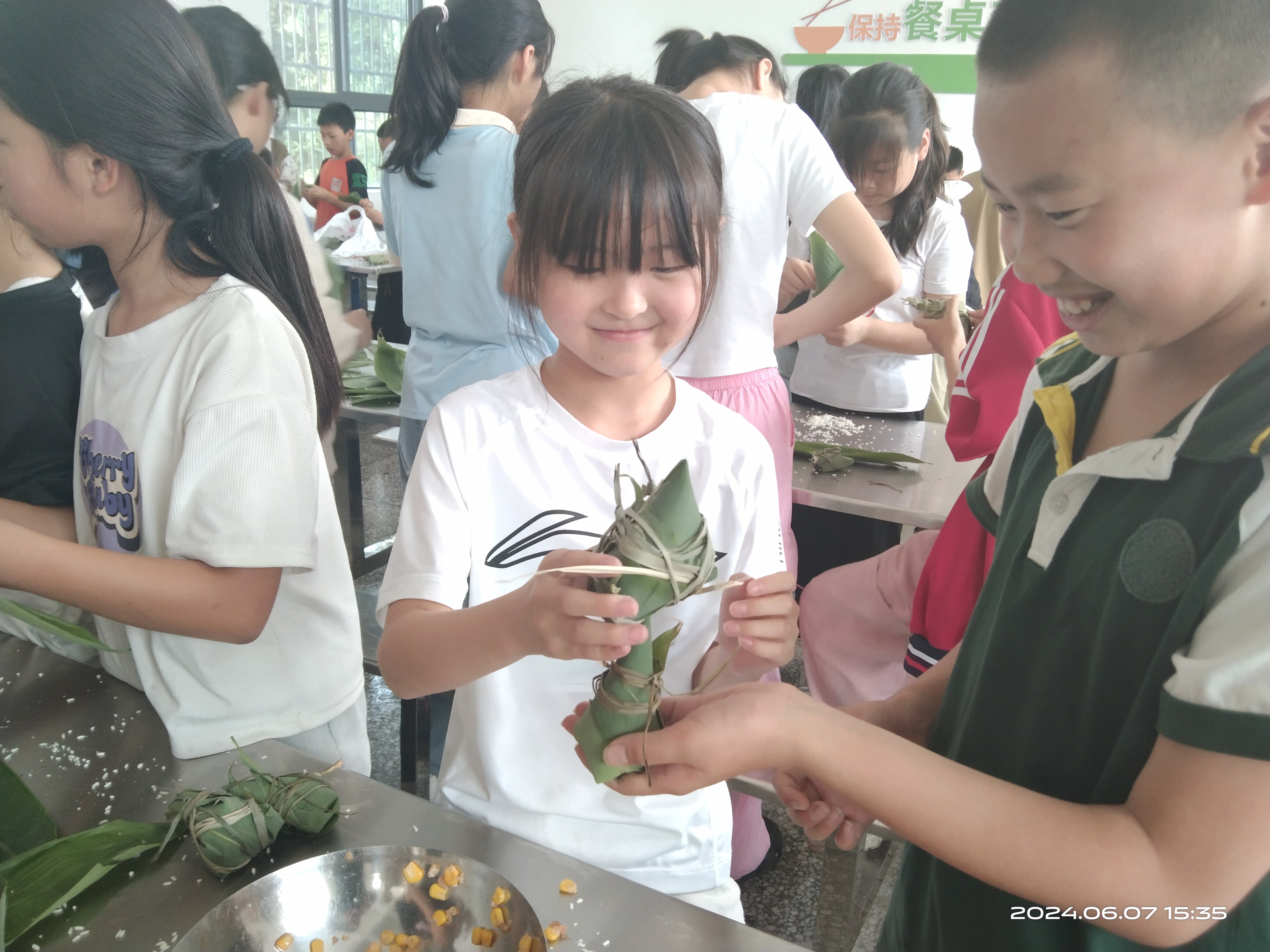 “把粽叶卷出一个窝,放上糯米,装上馅料,用手卷紧了……”活动中,教师手把手地教学生们包粽子。学生们好奇又认真地跟着老师折粽叶、填糯米、装馅料、裹叶子、扎棕带,看似简单的几个步骤,操作起来却有难度——粽叶一折就破、棕带缠绕不严实、稍不留神糯米洒一地……但这些困难阻挡不了学生们的热情和决心,现场气氛非常热闹。经过几道工序的多次练习和不断返工之后,一个个形态各异的粽子跃然桌上。提着各式各样的劳动成果,学生们无比骄傲,脸上洋溢着成功的喜悦:这是我亲手包的!