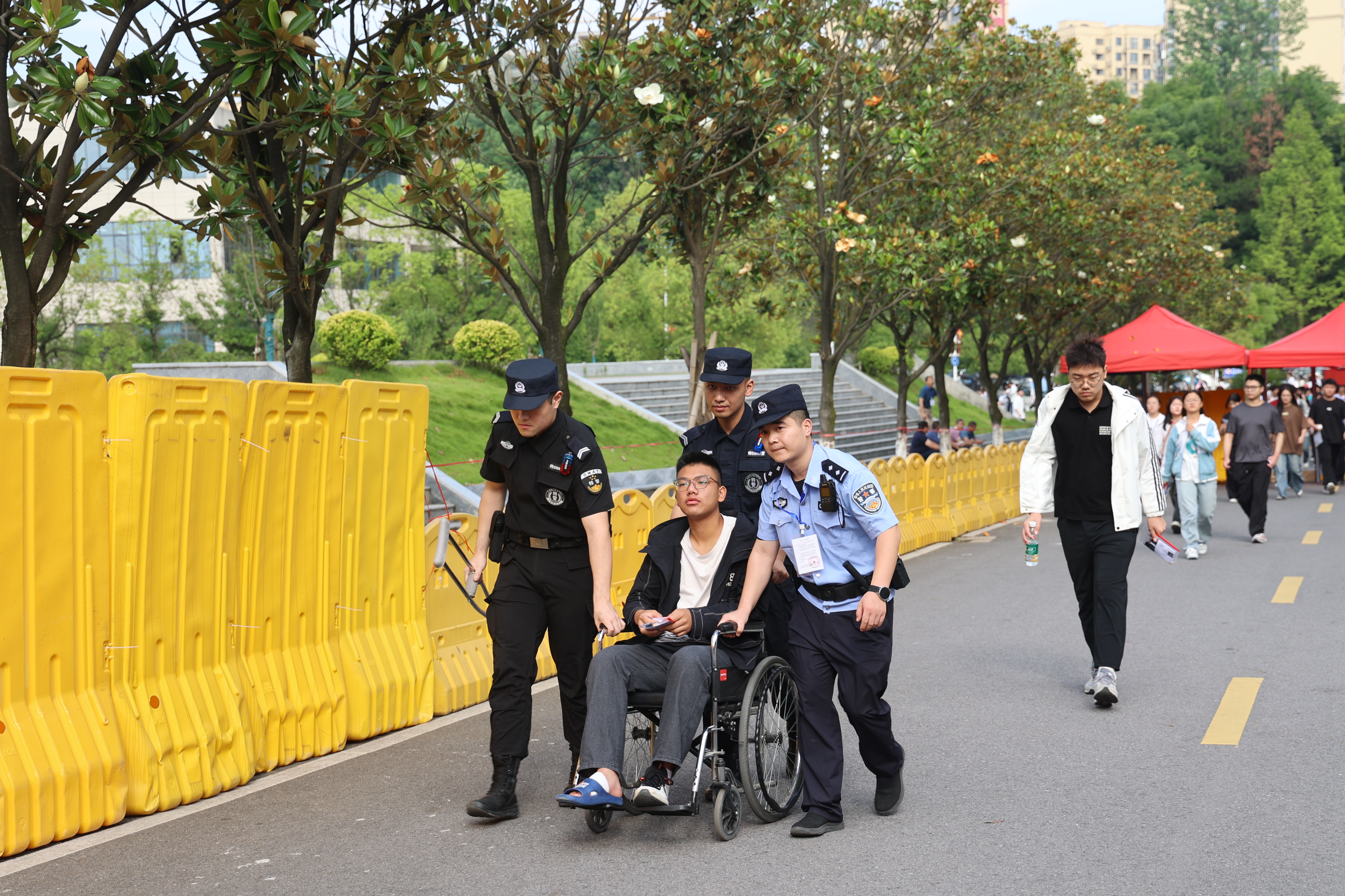 6月7日上午,执勤民警发现一中考场外有一名坐着轮椅的学生,因为家长不能进入考场,民警一路护送将考生背至考场入座,并为其加油打气。当日14时许,一考生到县一中考点门口才发现身份证落在家里,现场骑警紧急护送其回家取身份证,往返仅用10分钟,让考生顺利开考。