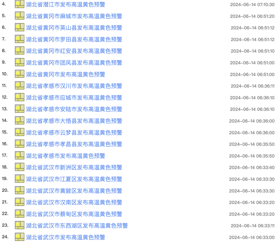 武汉市气象台2024年06月14日06时32分发布高温黄色预警信号:预计今天白天,我市大部地区最高气温将升至35℃以上,请注意防范。
