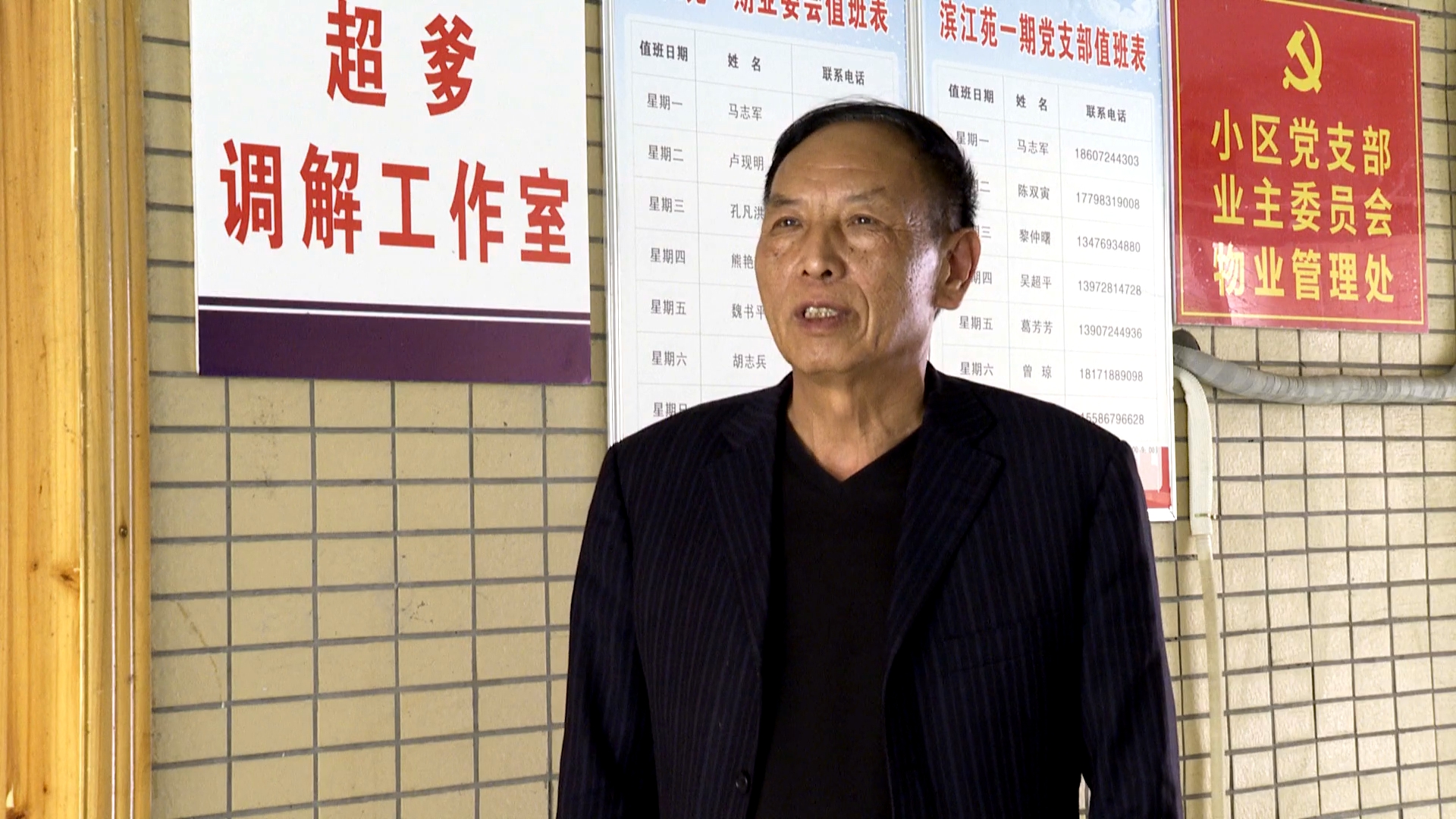 通城县隽水镇古龙社区滨江苑小区党支部书记吴超平正在主持一次调解。吴超平是通城县司法局退休干部,自担任小区党支部书记以来,在走访居民家时经常收到业主投诉物业、开发商等各种诉求,因此决定利用自己的专业知识为小区居民开展矛盾纠纷调解、维护小区和谐稳定。“超爹工作室”就是以吴超平的名字命名的小区调解工作室。滨江苑小区三栋超市装修导致楼上57户墙体受损,三栋住户与物业多次协商未果,未能得到有效解决,准备上访。超爹得知后,迅速梳理纠纷情况,并组织三栋业主、物业以及开发商协调。