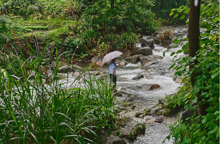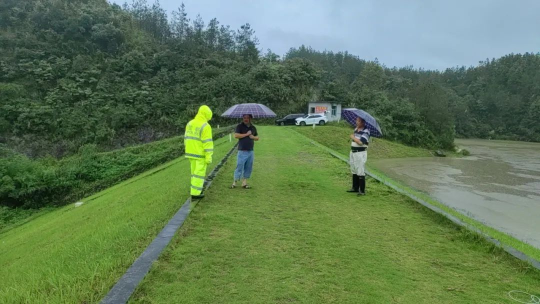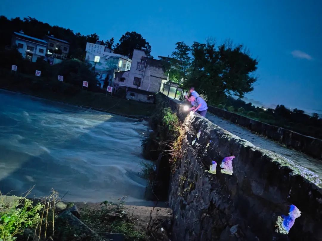 ▲塘湖派出所民辅警巡逻查看水库水位及溪流水流大小,并劝导疏散在溪里戏水人员。