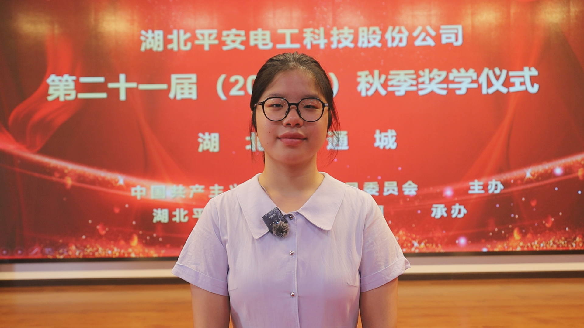 通城学生 廖芊晔:这是我第二次接受平安电工的资助,我觉得这份奖学金不仅是经济上的支持,更是对我们过去努力的认可和对未来发展的期许。这将激励我在大学不仅要在专业领域深耕细作,更要广泛涉猎,将来更好地回馈社会,当一个对社会有用的人。