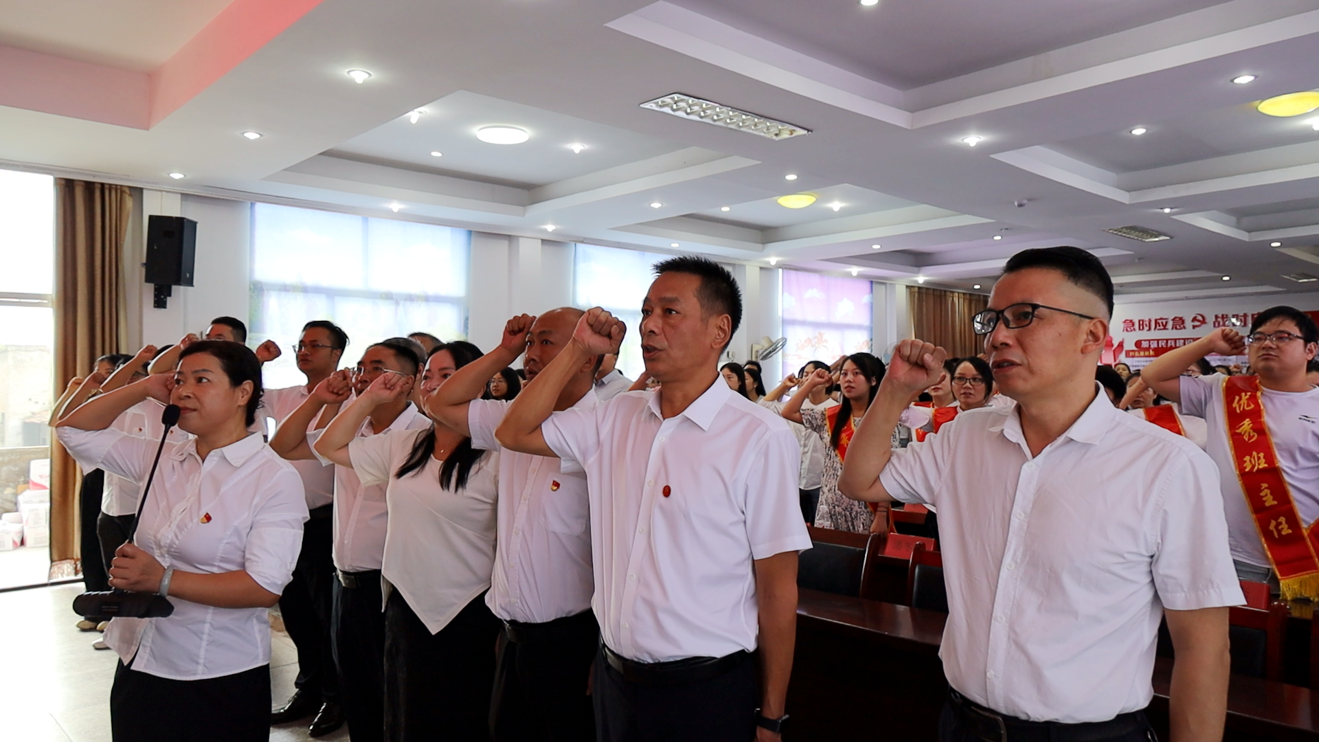 会上,全体教师重温入职誓词。教师们站姿挺拔,在领誓人的带领下,高举右拳,庄严宣誓。