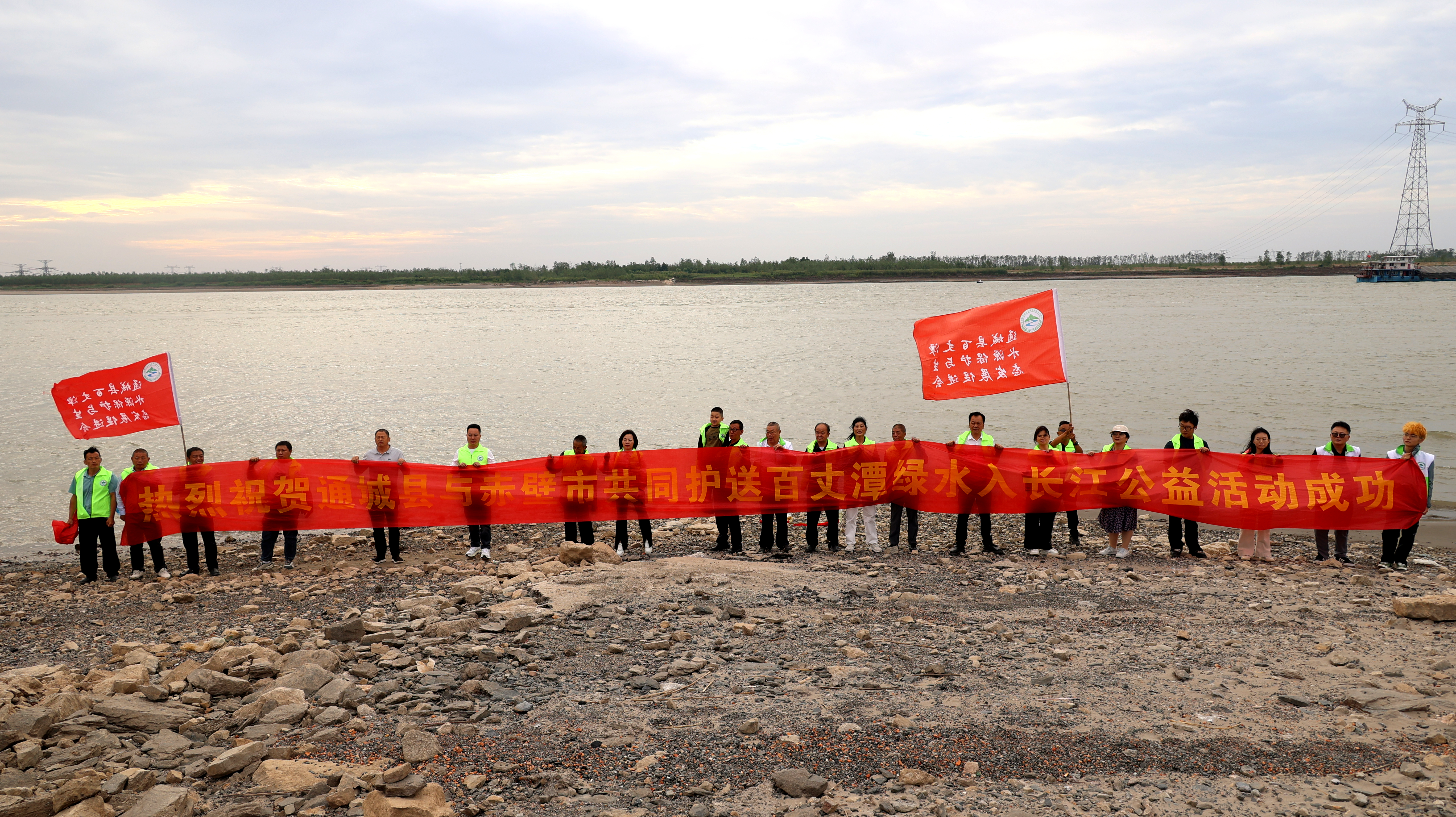上午12点,志愿者们乘车来到赤壁市,受到赤壁市人大常委会党组书记、主任叶文华一行的热情接待,双方进行了短暂友好交流。在赤壁市陪同人员的邀请下,志愿者们乘船考察了陆水湖水源保护情况,并齐聚至陆水湖中央,举行了“百丈潭绿水注入陆水湖”仪式。随后,志愿者们还来到赤壁古战场景区长江滩头,举行“百丈潭绿水入长江”仪式。